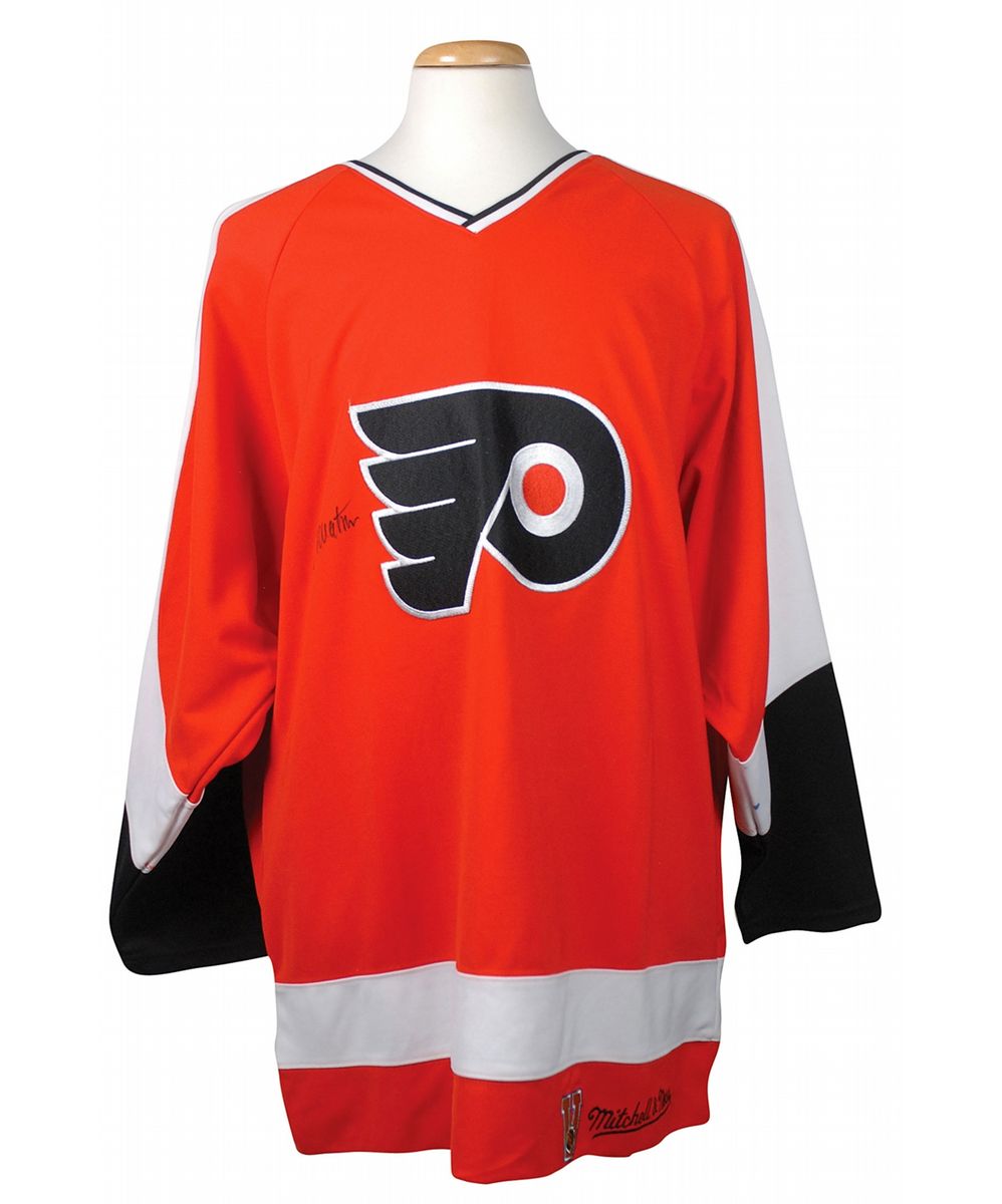 Official Mitchell & Ness replica Philadelphia Flyers hockey jersey, with sewn on letters and numbers, signed in silver ink on the number on the back by 12 members of the 1973–74 Stanley Cup champion team: Bobby Clarke, Bernie Parent, Reggie Leach, Bill Barber, Rick MacLeish, Joe Watson, Jim Watson, Ed Van Impe, Dave Schultz, Bob Kelly, Orest Kindrachuk, and Wayne Stephenson. Also signed again on the front in black felt tip by Joe Watson. In fine condition.
