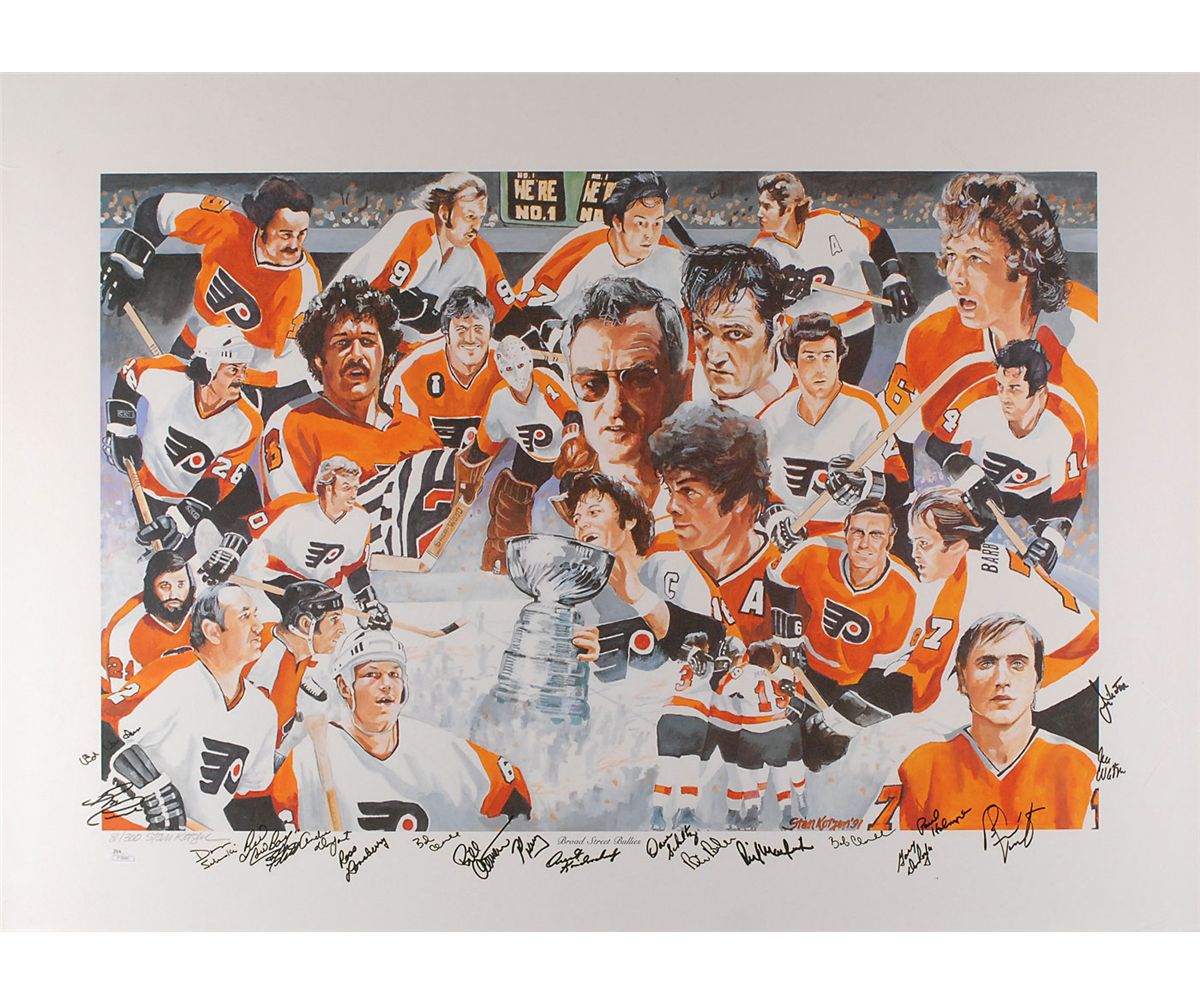 Color limited edition 25 x 35 print entitled ‘Broad Street Bullies,’ numbered 81/300, signed in black felt tip by 17 members of the team, including: Bill Barber, Rick MacLeish, Bobby Clarke, Bill Clement, Gary Dornhoefer, Rick Dupont, Bill Flett, Paul Holmgren, Bob Kelly, Ores Kindrachuk, Ross Lonsberry, Bernie Parent, Don Saleski, Dave Schultz, Ed Van Impe, Jimmy Watson, and Joe Watson. Also signed in pencil by the artist, Stan Kotzen. Rolled and in fine condition, with some haloing to signatures and a JSA label affixed to the lower left. Accompanied by a full letter of authenticity from JSA.