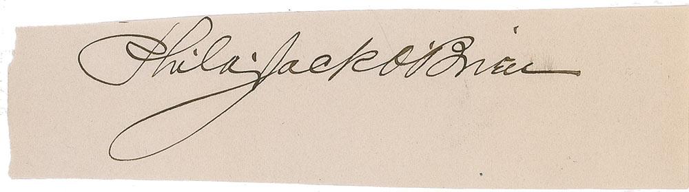 One of the most colorful fighters of the early twentieth century (1878-1942). Vintage ink signature, “Phila. Jack O’Brien,” on an off-white 5.5 x 1.5 slip. In fine condition, with slightly irregular edges.