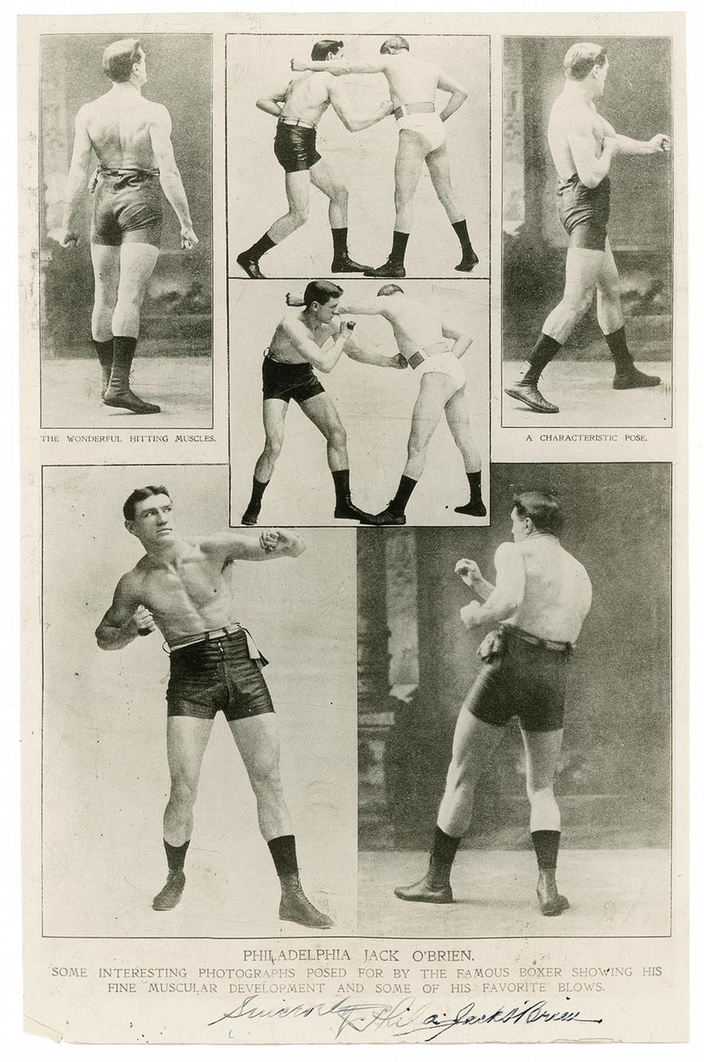 One of the most colorful fighters of the early twentieth century. Vintage glossy 8.75 x 13.5 composite photo of O’Brien striking several pugilistic poses, signed in fountain pen, “Sincerely, Phila. Jack O’Brien.” In very good condition, with sentiment and beginning of signature a couple shades light, some light skipping to signature, scattered light creases, and missing lower left corner tip.