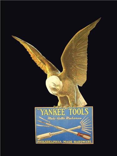 Philadelphia Made Hardware Die Cut Sign, cardboard easel back Eagle for Yankee tools screwdriver. Repair to left wing otherwise excellent condition. 18 X 25 inches.