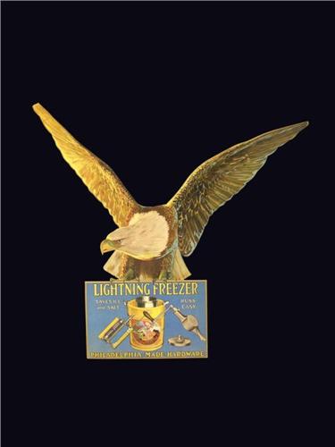 Philadelphia Made Hardware Die Cut Sign, cardboard easel back Eagle for the Lightning Ice Cream Freezer. Wing tip broken off otherwise good condition. 26 X 24 inches.