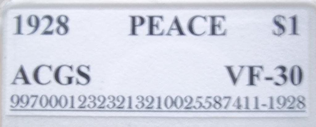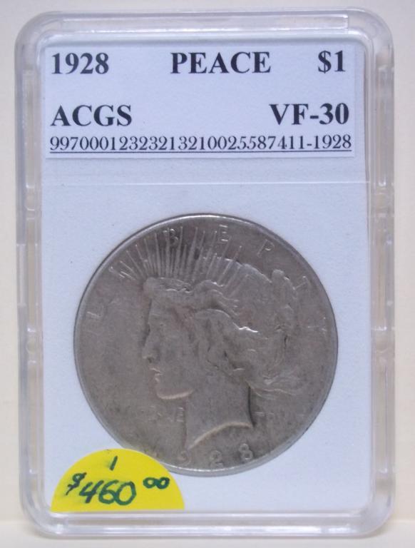 Key date Philadelphia mint 1928 Peace Dollar, ACGS certified, and graded Very Fine-30. A very nice key date coin.