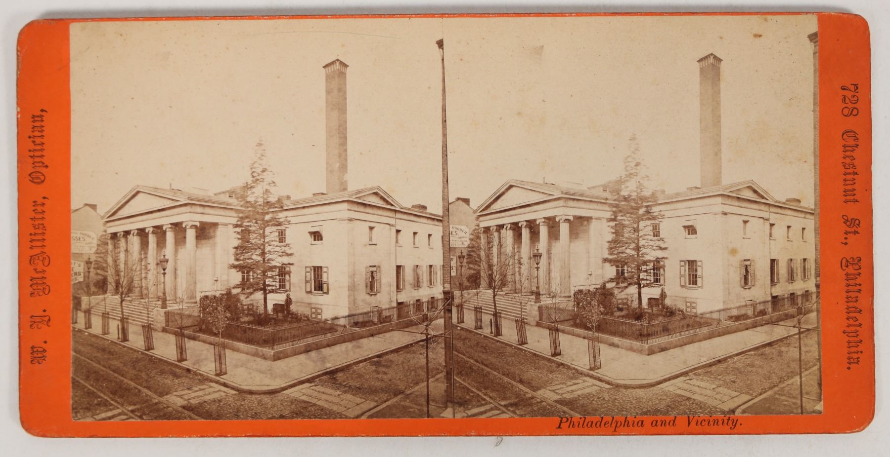 Nice stereoview of the Philadelphia Mint by WY McAllister, Optician, 728 Chestnut St., Philadelphia. This was the second Philadelphia Mint building built in 1833 (a third would be built in 1901 and a fourth in 1969). McAllister operated as the sole proprietor of the optician store, including the publication of stereographs, between 1865 and 1882.