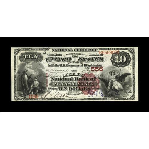 <B>Philadelphia, PA</B></I> - $10 1882 Brown Back Fr. 480 <B>The Commercial NB of Pennsylvania</B></I> Ch. # 556<BR>We are sorely tempted to award this gorgeous Brown Back the full Choice New grade, but the existence of the lightest of folds compels us to call this <B>Choice About Uncirculated.</B></I> In all other respects this specimen is an absolute peach, with great color, signatures, and tremendous eye appeal. It's also a considerably scarcer Philadelphia bank, with no offerings of any kind recorded for the past seven years.<BR><BR><b>Shipping:</b> Coin/Currency (<a target="_blank" href="http://www.heritageauctions.com/common/shipping.php">view shipping information</a>)