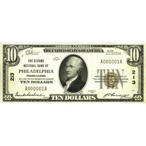 <B>Philadelphia, PA</B></I> - $10 1929 Ty. 1 <B>The Second NB</B></I> Ch. # 213<BR>A Serial # 1 note that is the only known survivor from the first sheet of this type and denomination from here, although the full $5 Serial #1 sheet was saved for the collecting fraternity. A classic three fold <B>Extremely Fine.</B></I> with the same degree of crispness it possessed on the very day it was pulled from the press.