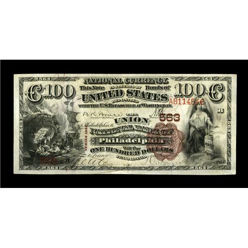 <B>Philadelphia, PA</B></I> - $100 1882 Brown Back Fr. 520 <B>The Union NB</B></I> Ch. # 563<BR>This $100 Brown Back has long been listed in the census as CU. Although high grade, it unfortunately does not achieve that lofty ranking after close inspection, as there are a couple of light folds which must be noted. There are also a couple of skilled margin restorations which can be observed only when the note is candled. That said, it is an attractive piece which is certain to please collectors looking for a high grade example of this most sought after type. <B>Extremely Fine+.</B></I><BR><I>From The Bill and Kathy Stella Currency Collection</B></I><BR><BR><b>Shipping:</b> Coin/Currency (<a target="_blank" href="http://www.heritageauctions.com/common/shipping.php">view shipping information</a>)