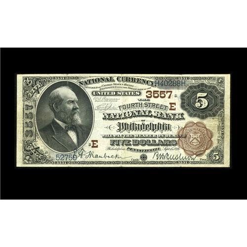 <B>Philadelphia, PA</B></I> - $5 1882 Brown Back Fr. 469 <B>The Fourth Street NB</B></I> Ch. # (E)3557<BR>A nice $5 Brown Back with good color and green pen signatures. There is one small split at the top that is barely noticeable. <B>Very Fine.</B></I>