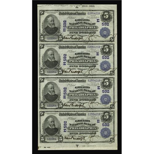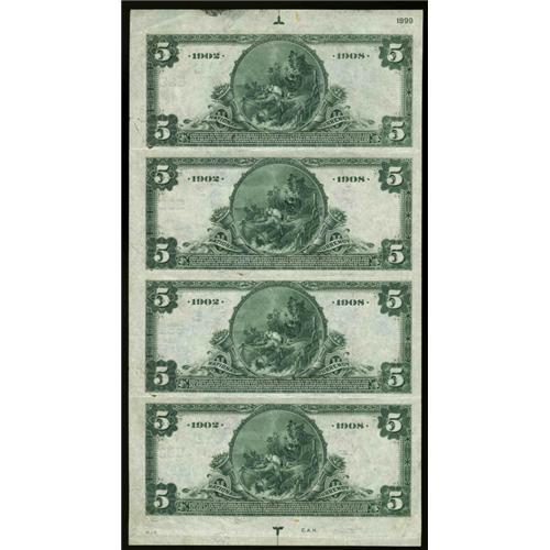 <B>Philadelphia, PA</B></I> - $5 1902 Date Back Fr. 590 <B>The Girard NB</B></I> Ch. # (E)592 Uncut Sheet<BR>This is the sole uncut sheet reported from this Philadelphia bank, and it is a pretty one indeed, with full selvage on both top and bottom, bold pen signatures, and vivid colors and inks. There is some handling, and folds between each note, but this is still one of the nicer uncut sheets we've seen in recent years. <B>Crisp Uncirculated.</B></I>