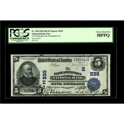 <B>Philadelphia, PA</B></I> - $5 1902 Date Back Fr. 590 <B>The Philadelphia NB</B></I> Ch. # (E)539<BR>This bright <B>PCGS Choice About New 58PPQ</B></I> appears to be fully embossed and comes from a run of nearly consecutive serials listed in the Kelly census as "CU." While there must certainly have been a reason for the assigned grade, we are unable to detect it through the encapsulation surfaces. The final realization will likely be more consistent with what would be expected for a fully uncirculated note.<BR><I>From The Bill and Kathy Stella Currency Collection</B></I><BR><BR><b>Shipping:</b> Coin/Currency (<a target="_blank" href="http://www.heritageauctions.com/common/shipping.php">view shipping information</a>)