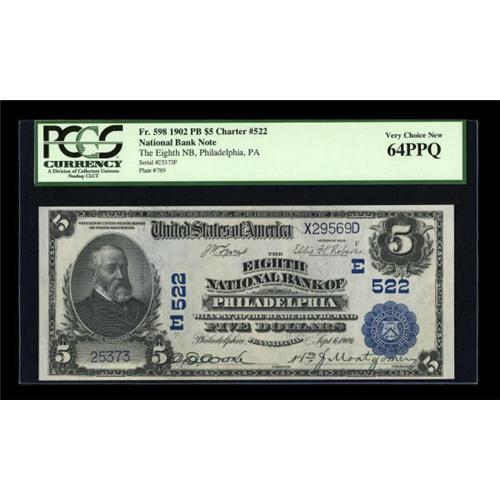 <B>Philadelphia, PA</B></I> - $5 1902 Plain Back Fr. 598 <B>The Eighth NB</B></I> Ch. # (E)522<BR> Very interesting pen signatures grace this lovely note that is well margined and nicely embossed. <B>PCGS Very Choice New 64PPQ</B></I>.<BR><BR><b>Shipping:</b> Coins & Currency (<a target="_blank" href="http://www.heritageauctions.com/common/shipping.php">view shipping information</a>)
