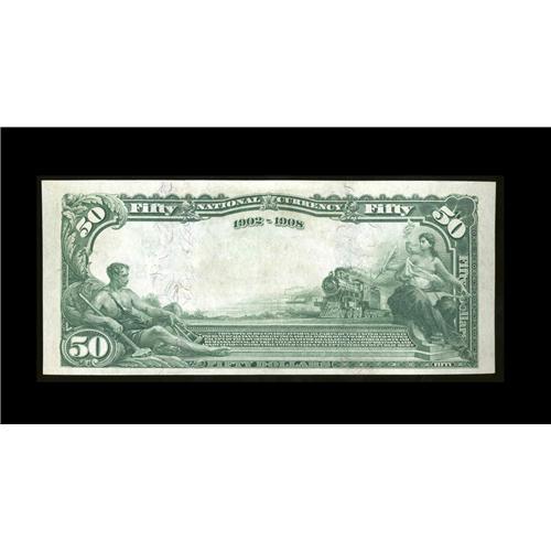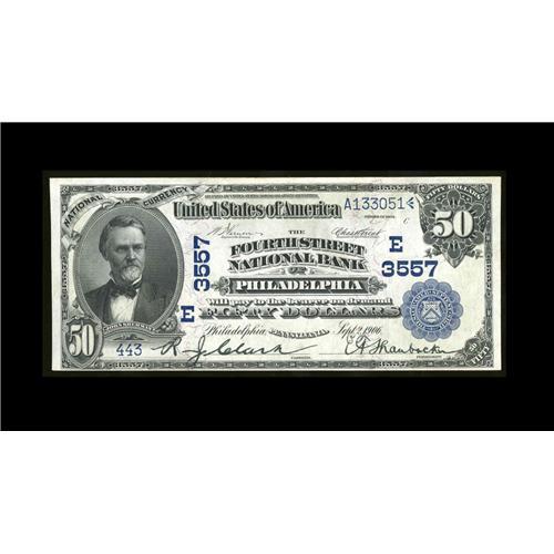 <B>Philadelphia, PA</B></I> - $50 1902 Date Back Fr. 669 <B>The Fourth Street NB</B></I> Ch. # (E)3557<BR>While this hardly qualifies as a rare bank, this example is the only Blue Seal high denomination reported from here. <B>Choice Crisp Uncirculated,</B></I> with nice pen signatures.