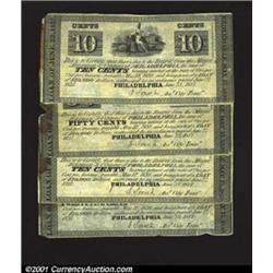 Philadelphia, PA - City of Philadelphia June 23, 183710¢ (2) VF, 25¢ Fine-VF, 50¢ Fine-VF, with a small piece missing from the left edge.<p>All four pieces are stained on the left end. 4 notes Important notice: We expect to be auctioning lots at the rate of 200-250 per hour. Sometimes eBay Premier live bid software cannot keep up with that pace, so we strongly recommend that you place a realistic proxy bid now as insurance to avoid disappointment. Also please note that all Heritage/CAA lots purchased through eBay Premier carry a 20% Buyer's Premium.