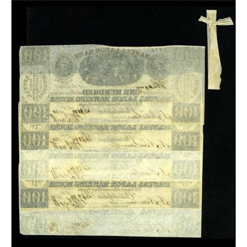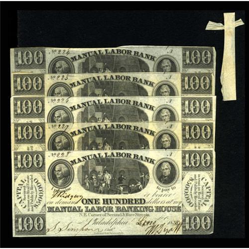 <B>Philadelphia, PA- Manual Labor Bank</B></I> $100 Sep. 10, 1838 Five Consecutive Examples<BR> This is only the second time we have offered this scarce denomination on this bank. The Elvis vignette is found on all dollar denominated notes of the Manual Labor Bank. This quintet is held with a tied period paper band. <B>Crisp Uncirculated</B></I><B><I>.</B></I></B></I><BR><BR><b>Shipping:</b> Coins & Currency (<a target="_blank" href="http://www.heritageauctions.com/common/shipping.php">view shipping information</a>)