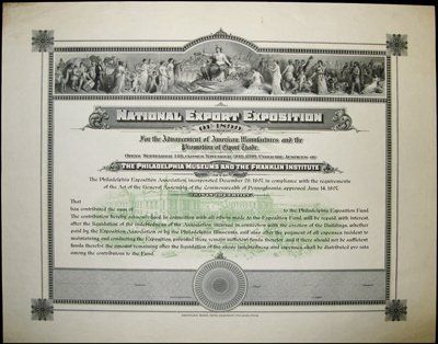 1897. Certificates. Uncancelled proof or specimen certificate. Magnificent 15.75 by 19.25 inch certificate with multiple vignettes. Top portion of certificate has 15 by 2 inch vignette that includes allegorical figures; cherubs; wild animals; men carrying trading goods and miscellaneous images. Additionally, there is a large central underprint of the exposition building in light green. Upper left corner has been soiled but otherwise in VF condition. Impressive rare certificate ABNC.