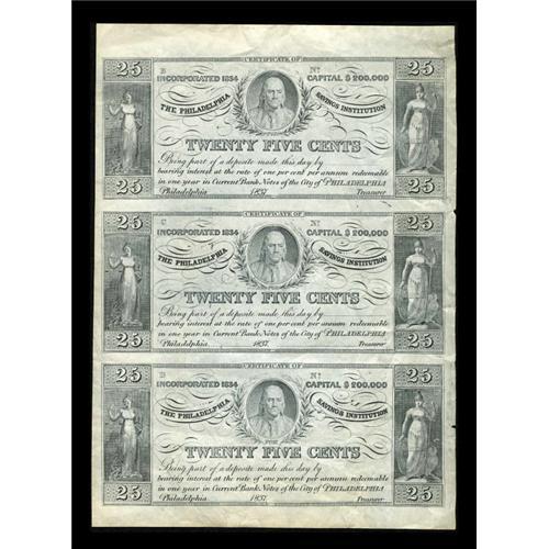 <B>Philadelphia, PA- Philadelphia Savings Institution </B></I>25¢ 1837 Hoober 305-537 Uncut Sheet of Three<BR> This is the first time we have encountered this financial institution in sheet form. Plate letters B, C, and D are found on this remainder. <B>Very Fine </B></I>with a couple of trivial edge nicks and a quarter inch bottom edge tear. <BR><BR><b>Shipping:</b> Coins & Currency (<a target="_blank" href="http://www.heritageauctions.com/common/shipping.php">view shipping information</a>)
