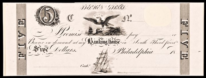 Philadelphia, PA. Stephen Girard’s Banking House. Five Dollars. Cut counter. India Paper Proof on Card.