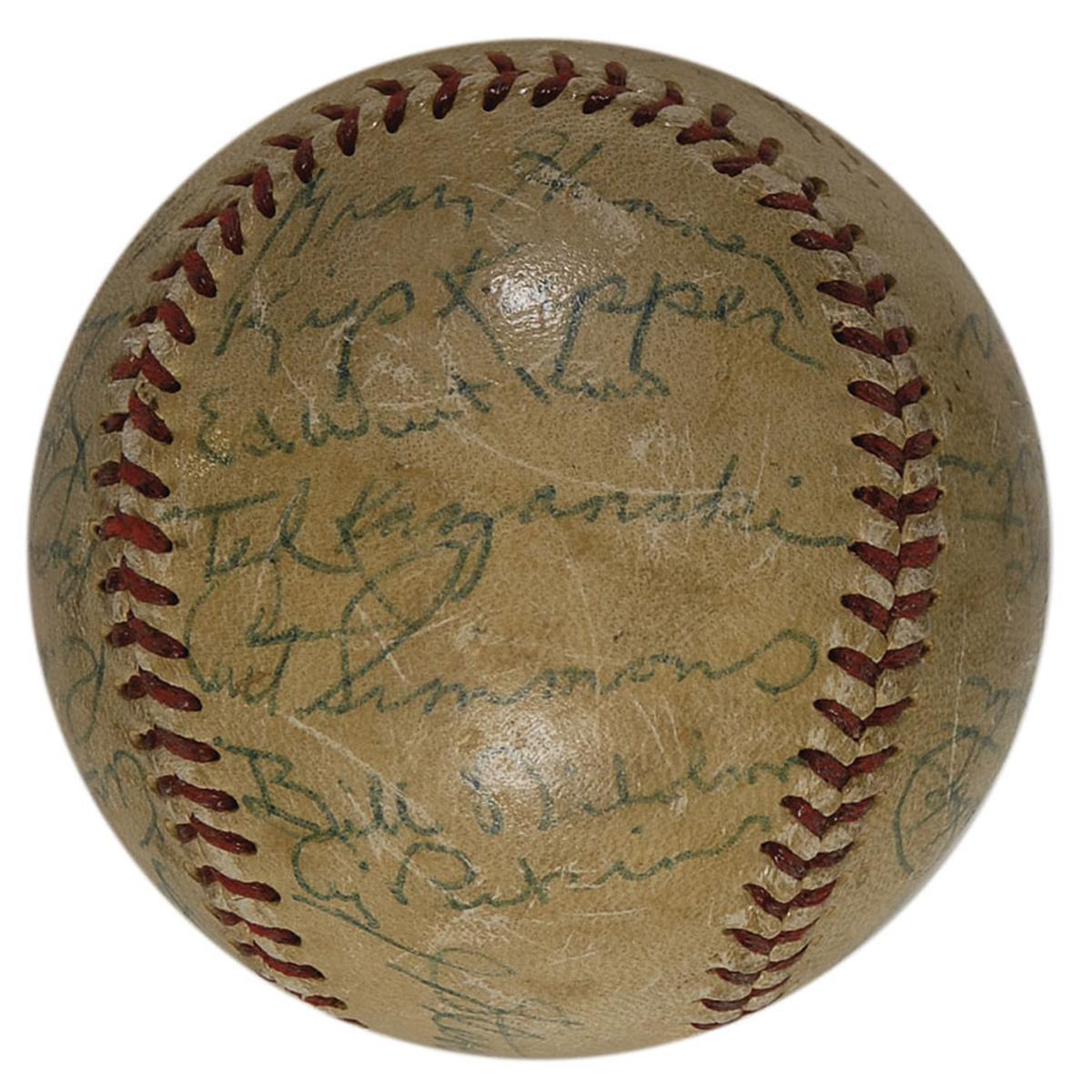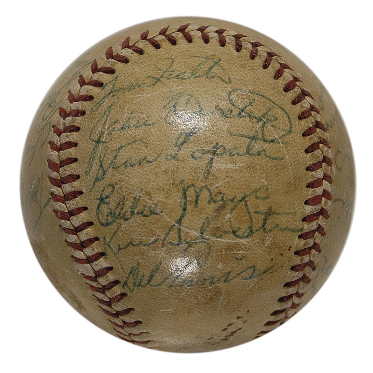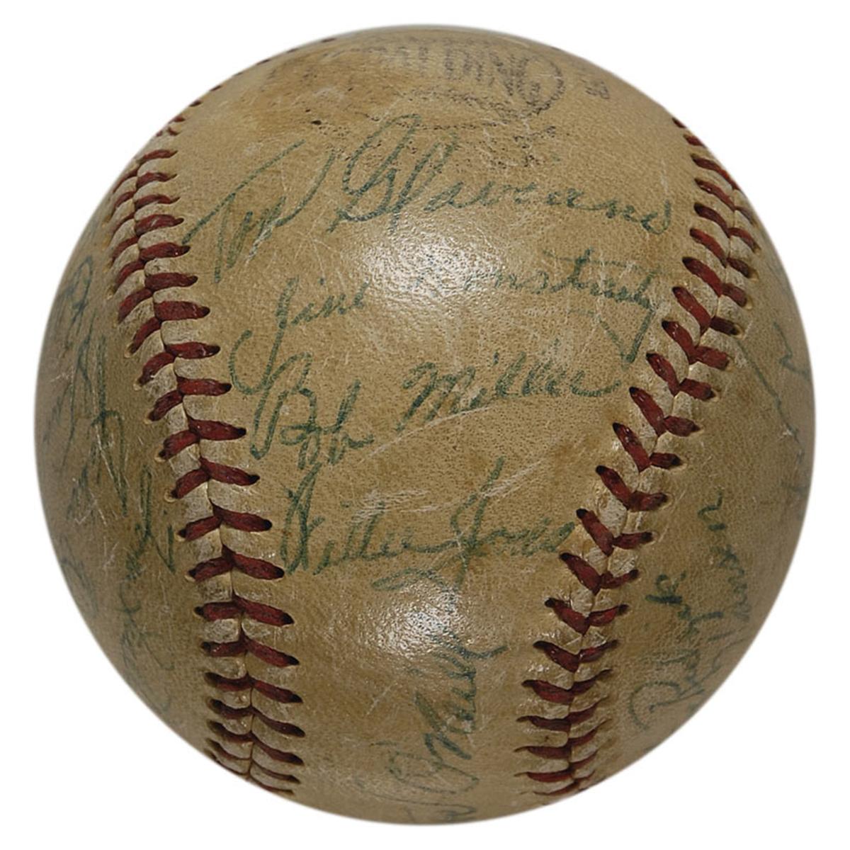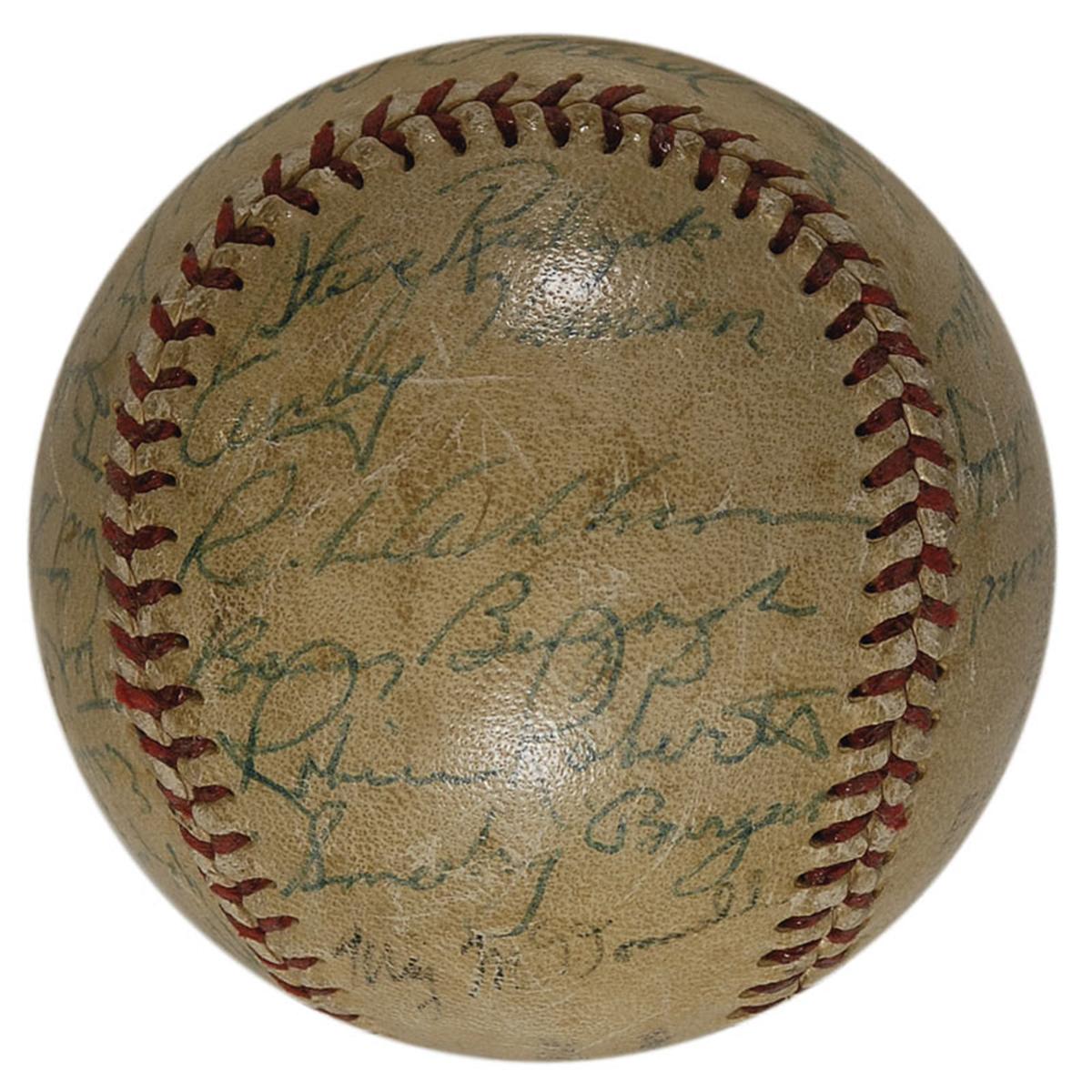Official Spalding baseball signed in blue ballpoint by 25 members of the 1953 Philadelphia Phillies. Signers include: Steve O’Neill (ss), Richie Ashburn, Robin Roberts, Tom Glaviano, Jim Konstanty, Bob Miller, Willie Jones, Curt Simmons, Ted Kazanski, Kip Kipper, Steve Ridzik, Smokey Burgess, Eddie Mayo, Stan Lopata, and John Wyrostek. In very good condition, with even moderate toning and scattered surface marks and soiling.