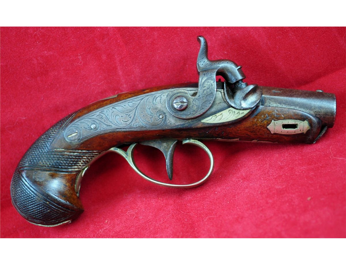 Ornate Cap and Ball, Derringer with engraved, inlaid German Silver Decoration escutchons etc. Pistol is unmarked, but has the features of John Krider's work. Produced between 1850 and 1870. Indecipherable proof mark on barrel, produced by an unidentified maker. 2" Barrel. Checkered grips. 'See photos for more information. Gun is being sold for decorative purposes NOT for firing. See photos for more information.Kennedys Auction Service has not attempted to test fire any gun in this auction and all guns are sold "IN AS IS CONDITION" and are not guaranteed to be operational.