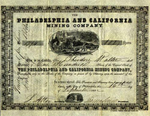 Philadelphia and California Mining Co. Pennsylvania, 1852, no. 1794. Set up primarily for gold mining, and owned by J.C. Fremont (although not signed by him), who ran for Presidency in 1856 against Buchanan. Vignette of mining camp and decorative border. Fine. Of significant rarity.