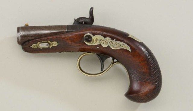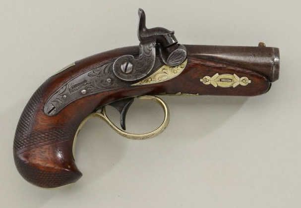 Philadelphia percussion derringer by Slotter but marked J. Derringer who was a taylor that allowed Slotter to use his name infringing on the design of Henry Deringer. The pistol measures 5-1/2” overall with 2” barrel of .41 caliber showing six (6) groove rifling and styled closely after Deringers design. The metal surfaces are in very good condition with traces of finish and good patina. There are some minor marks and normal aging. Thestocks are very good plus with slight wear and minute imperfections. Action is good and very good overall. Est.; $1,750-$3,500
