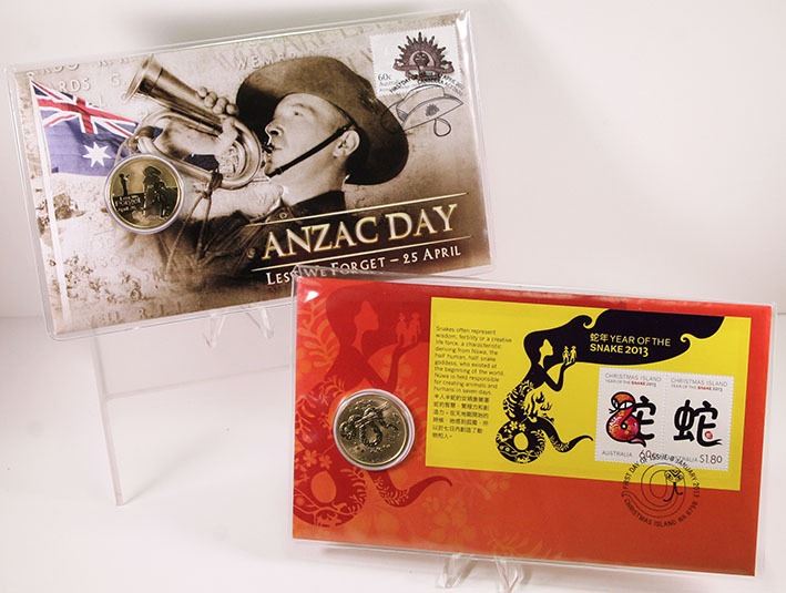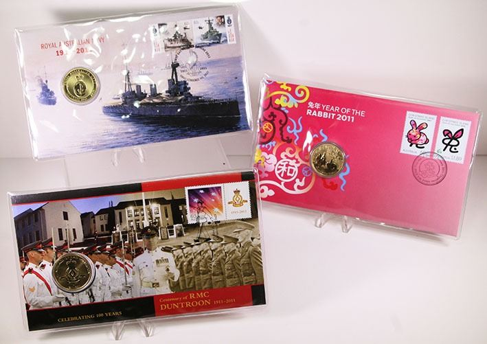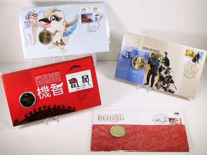 One Dollar, 2007 SAS, 2008 Beijing Games, 2008 Year of the Rat, 2010 Shanghai World Expo, 2011 year of the Rabbit, 2011 Duntroon, 2011 Royal Australian Navy, 2012 Anzac Day, 2013 Year of the Snake, all Perth Mint issues (9 covers)