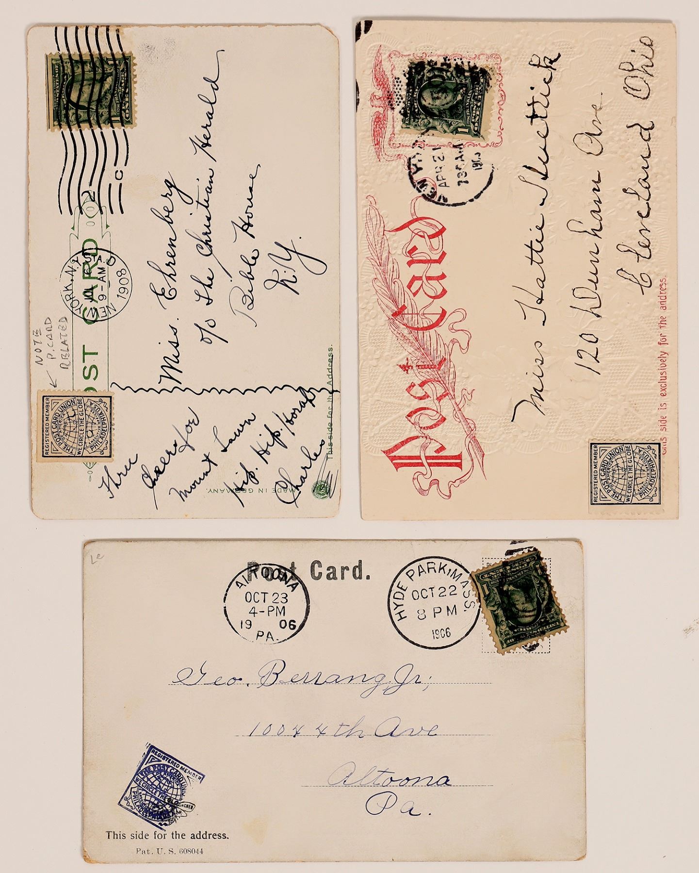 A trio of postcards that have postcard union adhesives, c1906-08. Postmarks New York, NY (2) and Altoona, PA.