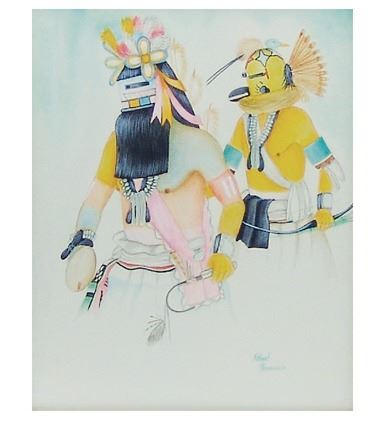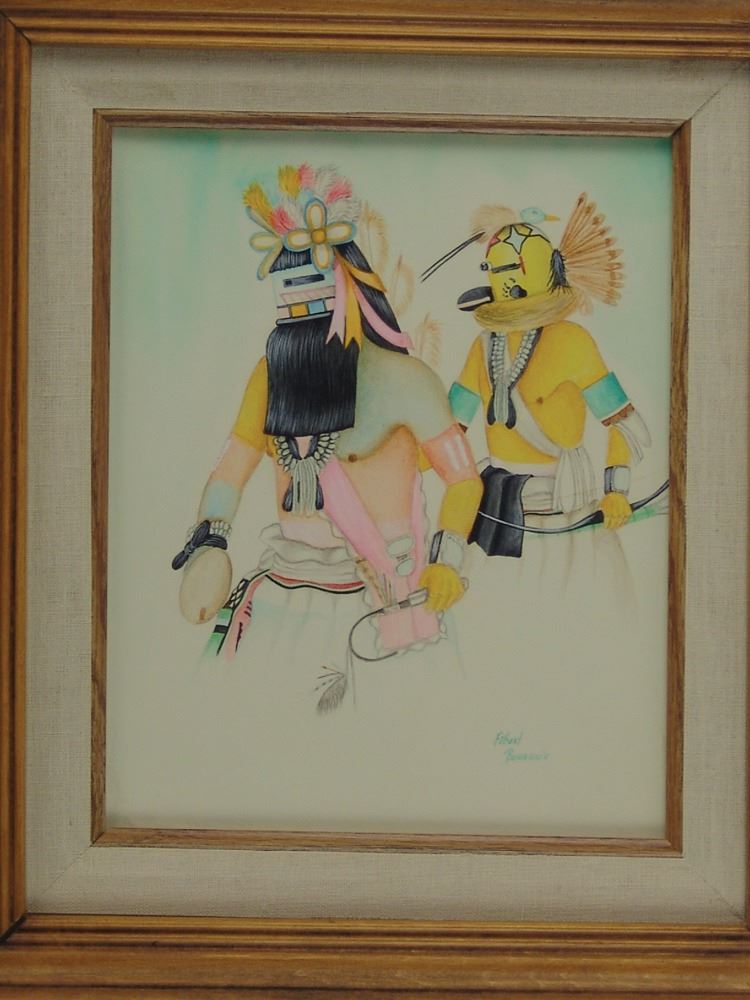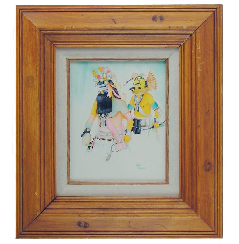 Beautiful signed original watercolor on paper depicting a pair of Zuni kachina dancers. Very good condition. Framed.,Mid/Late 1900s,9" x 7" (18" x 16" framed)