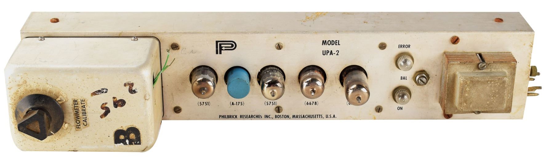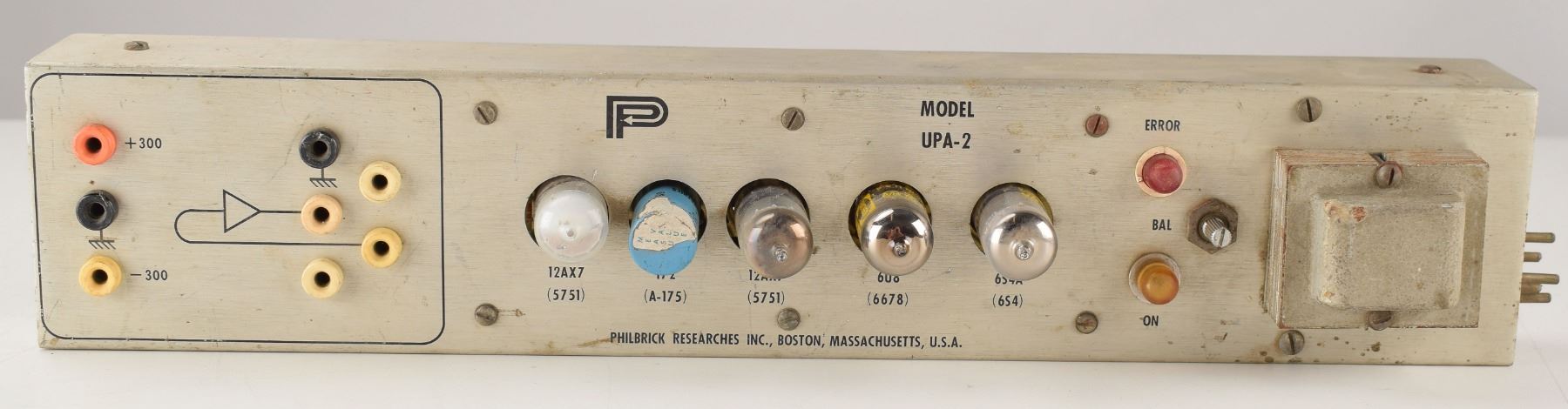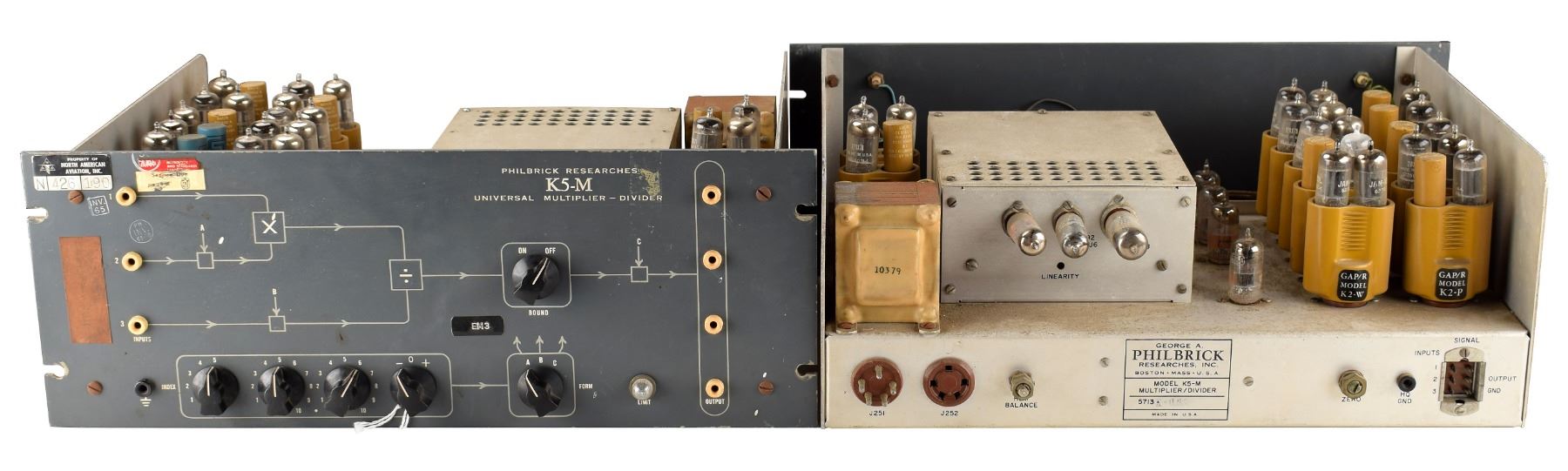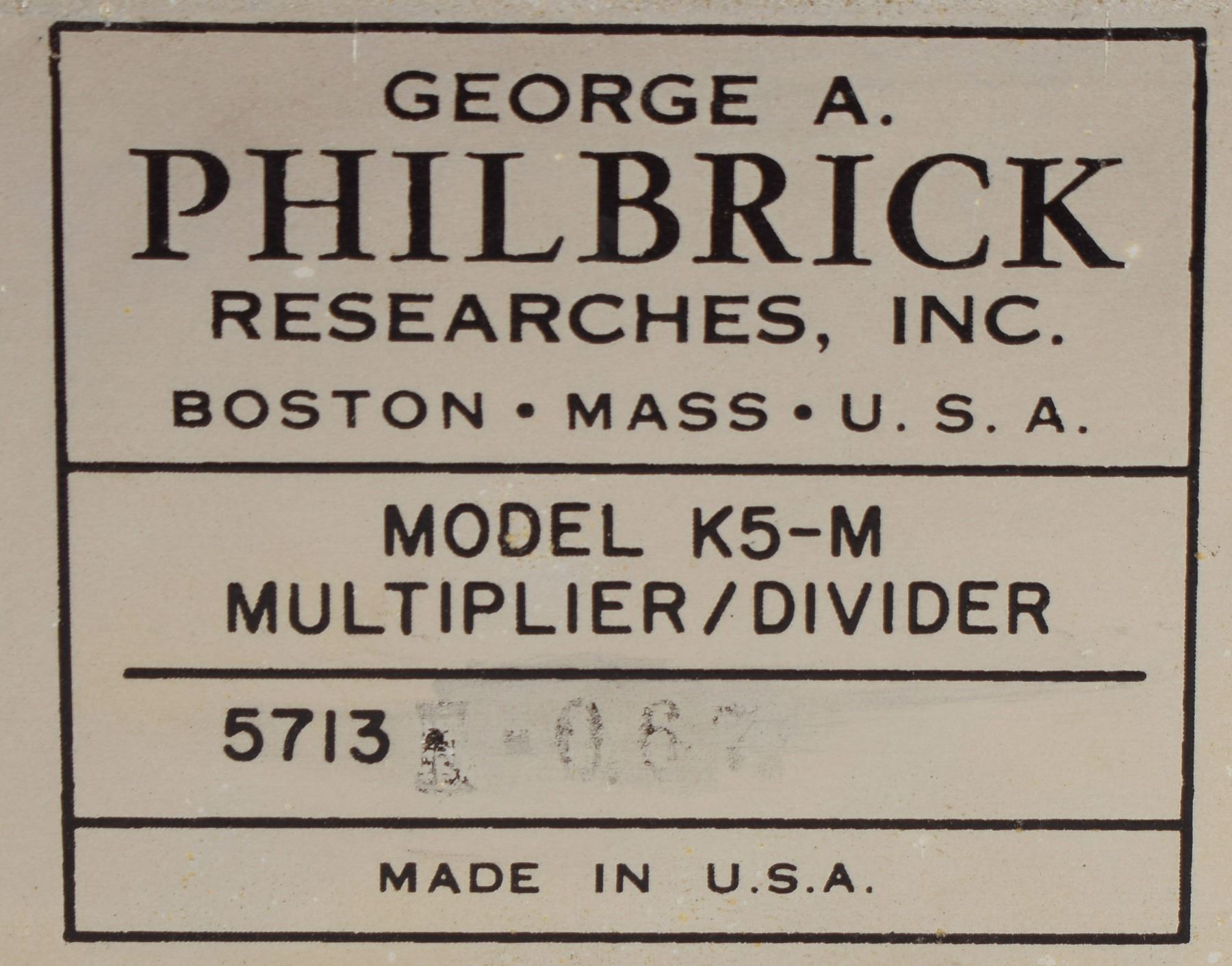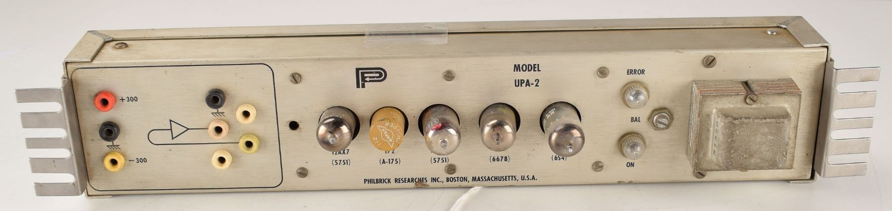 Collection of six components manufactured by Philbrick Researches, including: two rack-mountable K5-M Universal Multiplier-Divider units, each measuring 19? x 7? x 13?, both filled with vintage vacuum tubes; and four Model UPA-2 chopper stabilized operational amplifier units, measuring 17? x 3.25? x 2.5?, each featuring several vintage vacuum tubes and one with a "Flowmeter Calibrate" knob. In overall very good to fine condition. Founded by George A. Philbrick, Philbrick Researches was responsible for the commercialization and wide adoption of operational amplifiers, or op-amps, as well as electronic computers based on them.