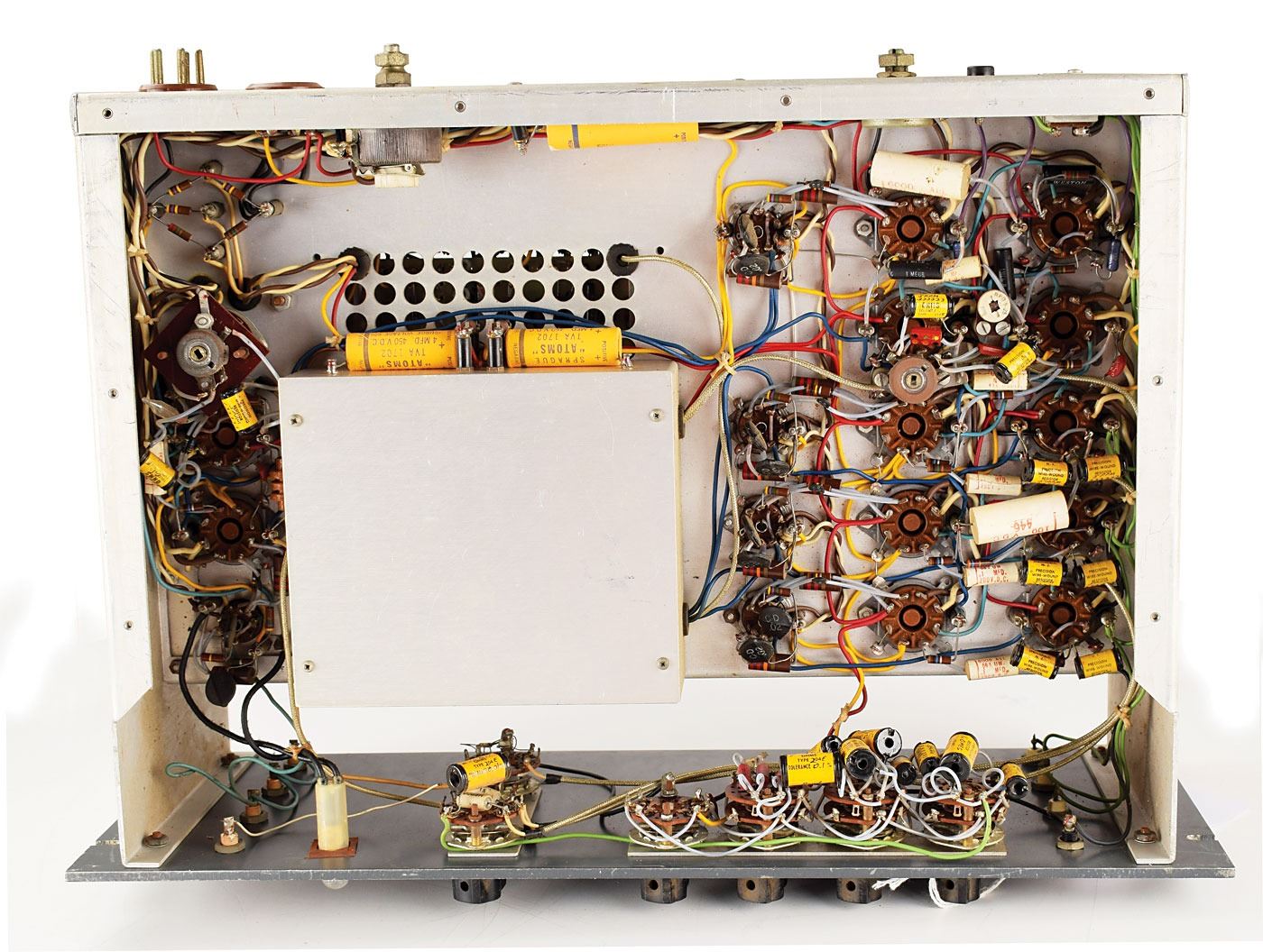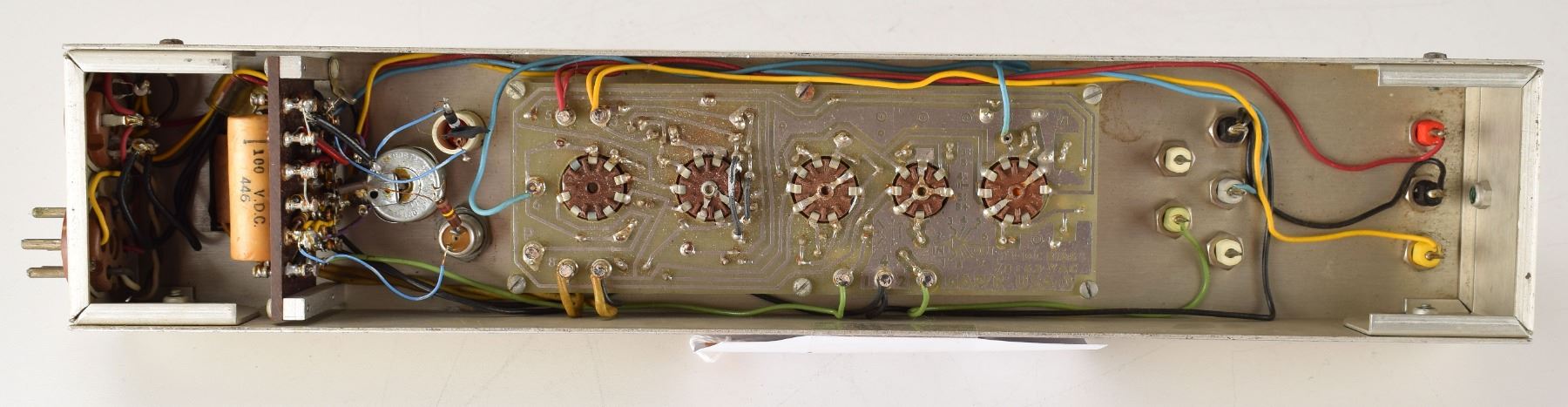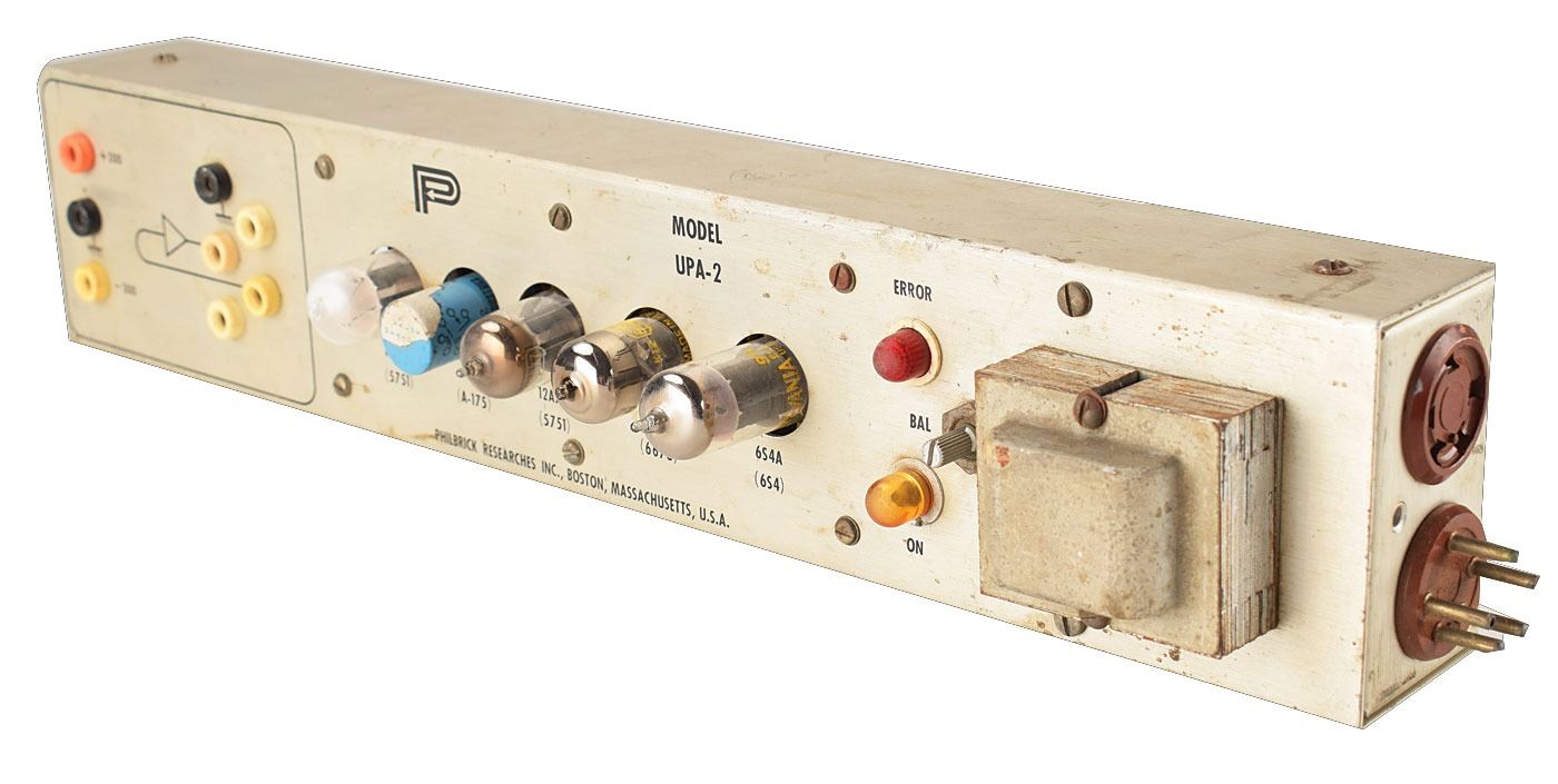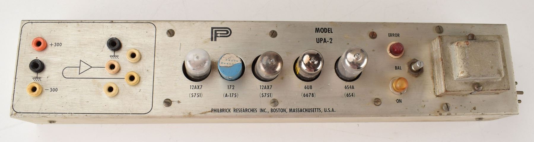 Collection of six components manufactured by Philbrick Researches, including: two rack-mountable K5-M Universal Multiplier-Divider units, each measuring 19? x 7? x 13?, both filled with vintage vacuum tubes; and four Model UPA-2 chopper stabilized operational amplifier units, measuring 17? x 3.25? x 2.5?, each featuring several vintage vacuum tubes and one with a "Flowmeter Calibrate" knob. In overall very good to fine condition. Founded by George A. Philbrick, Philbrick Researches was responsible for the commercialization and wide adoption of operational amplifiers, or op-amps, as well as electronic computers based on them.