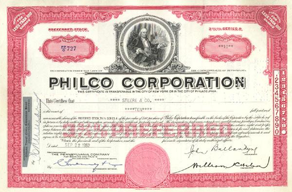 1952. Pennsylvania. Stock Certificate for 10 shares. Vignette at top center of Benjamin Franklin. Punch cancelled. Very fine.