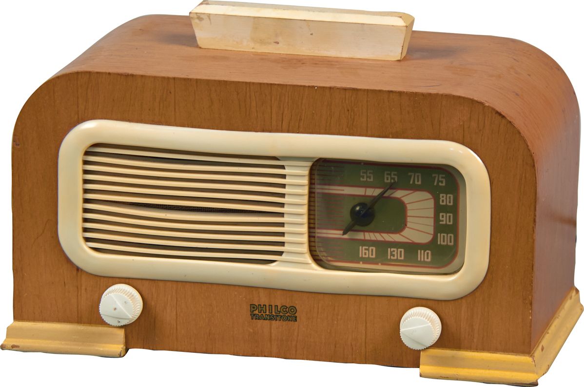 Philco Transitone Model 42-PT95 Tabletop Art Deco Wood AM Radio w/ plastic grill/escutcheon & 2 knobs, AC/DC 115 v - 13" x 6 1/2" x 8 1/4"