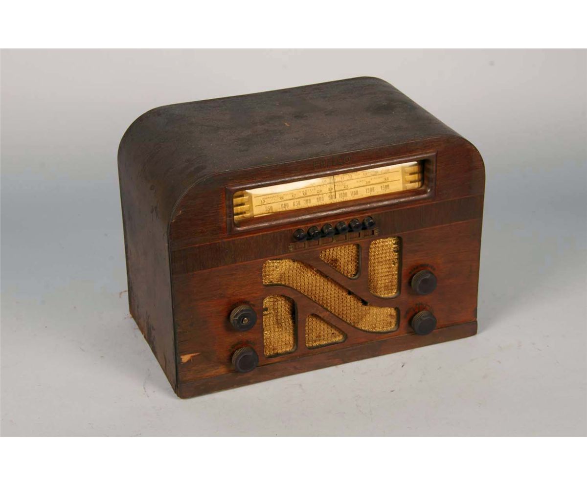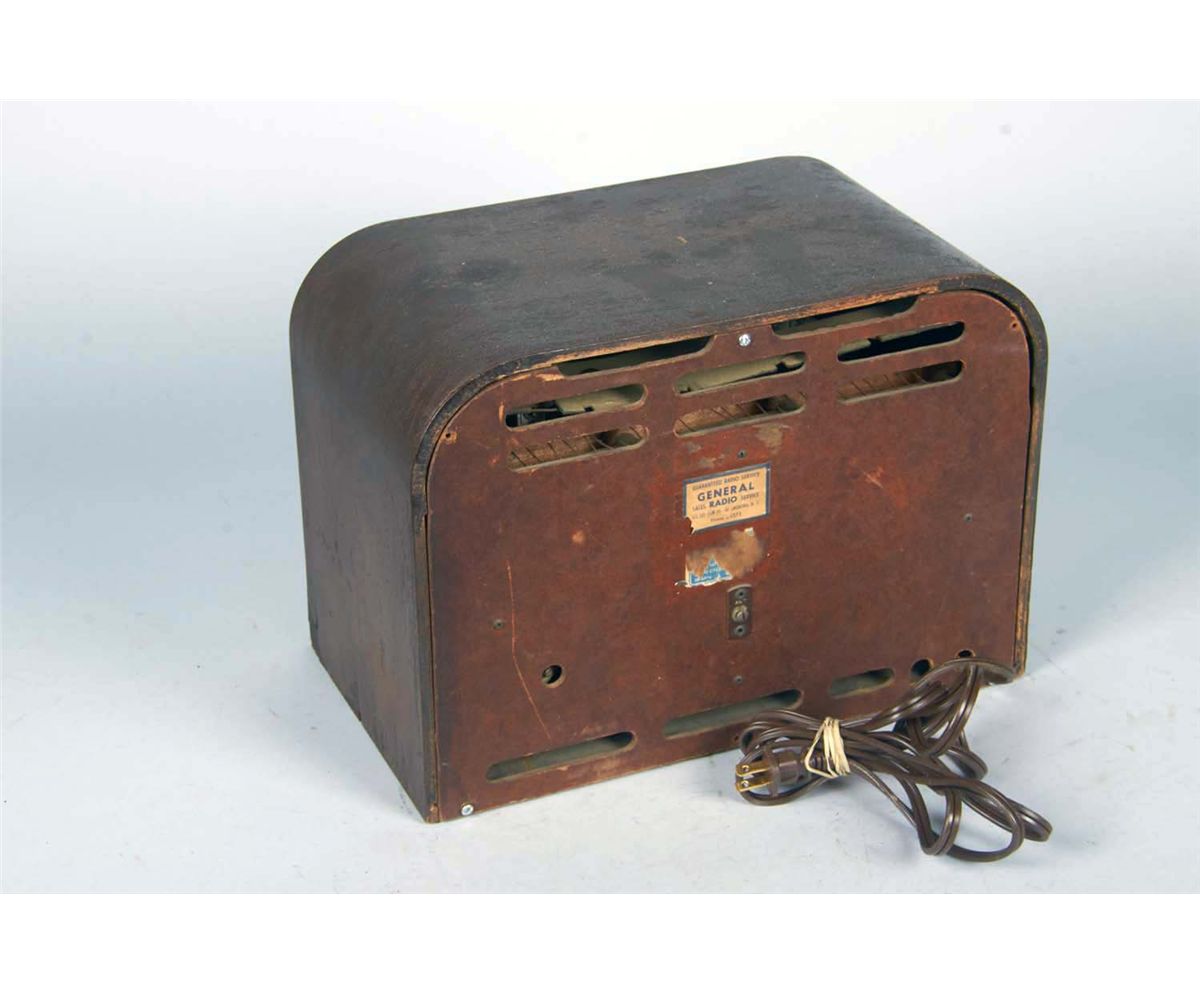 Early model 40-145T with cutout grille front features pushbutton tuning and preset label slats, slide rule dial with broadcast, police, and short wave bandwidths. Circa 1940. Condition (Good). Size 14" x 10" x 8"