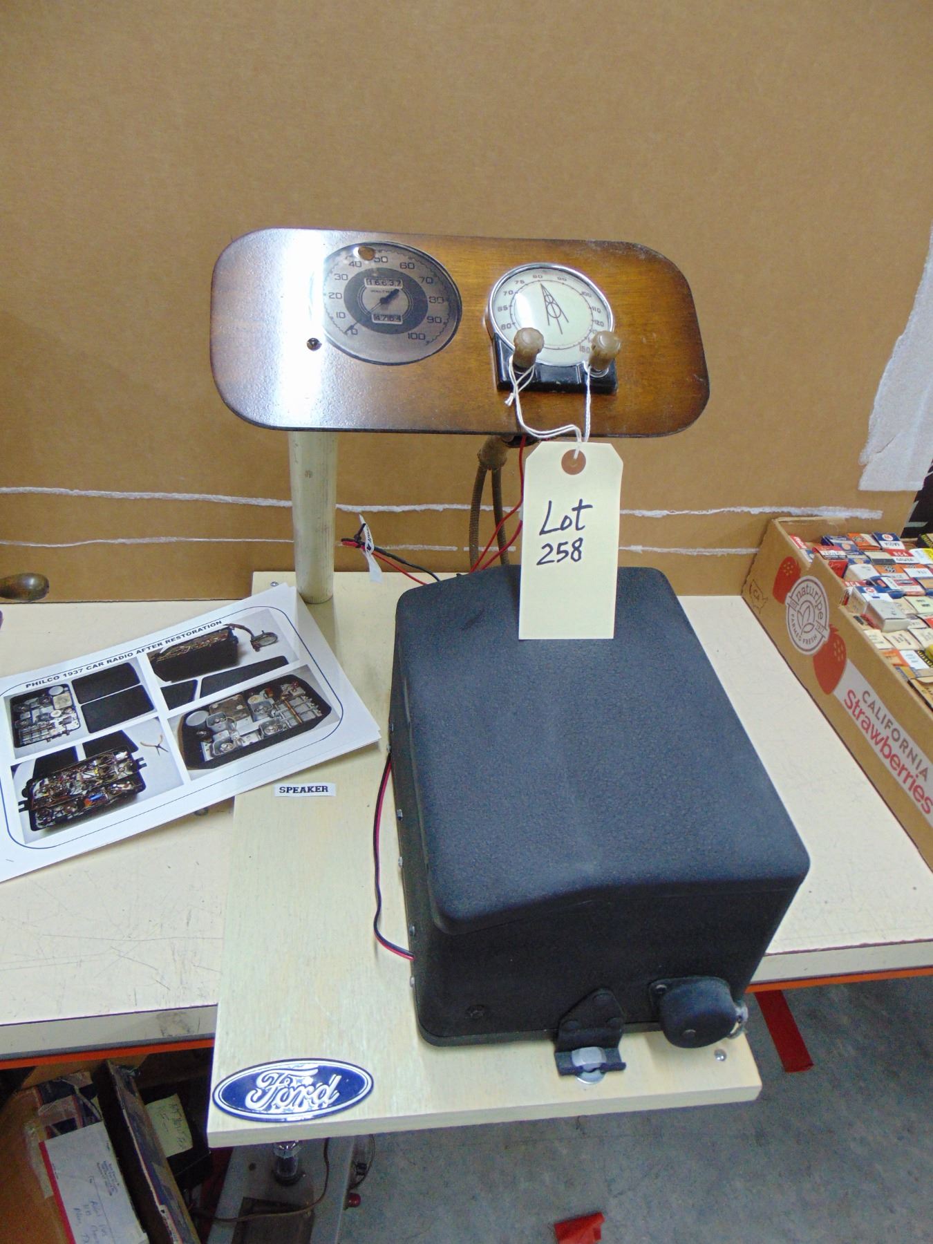 1937 Philco car radio model F-1440 manufactured for Ford; this is a working mock display with excellent playing 6 volt radio. This lot includes before and after restoration pictures.