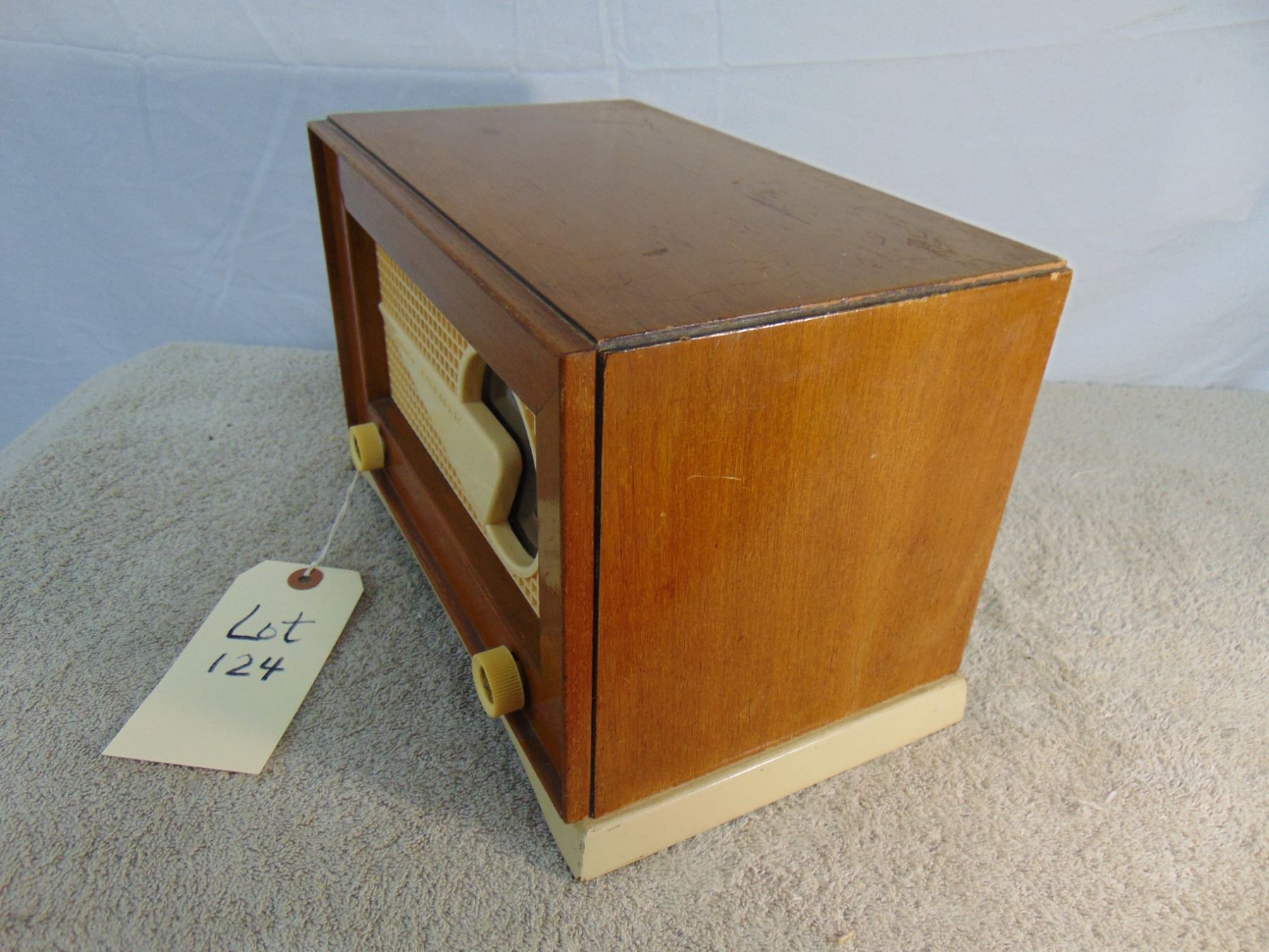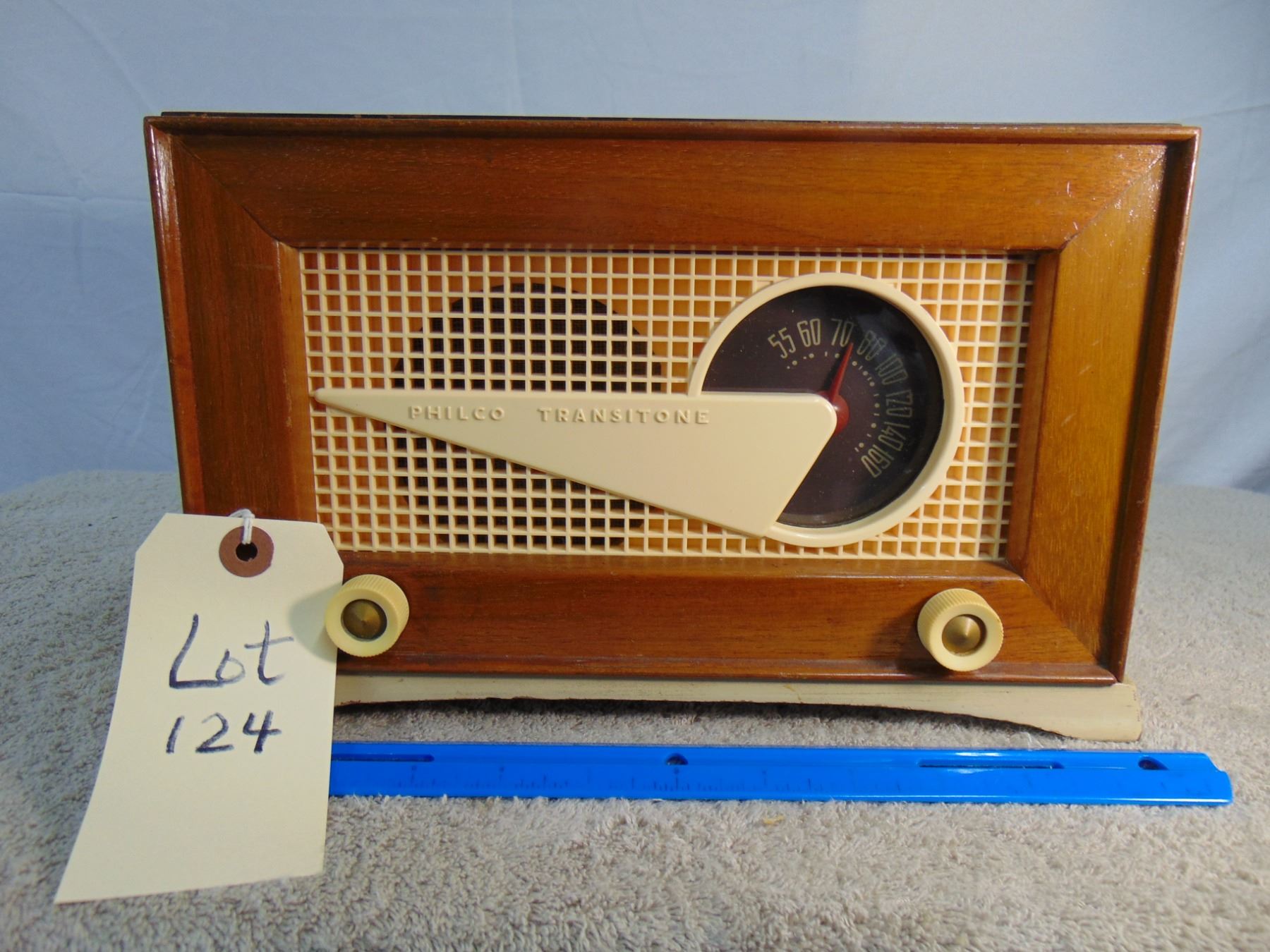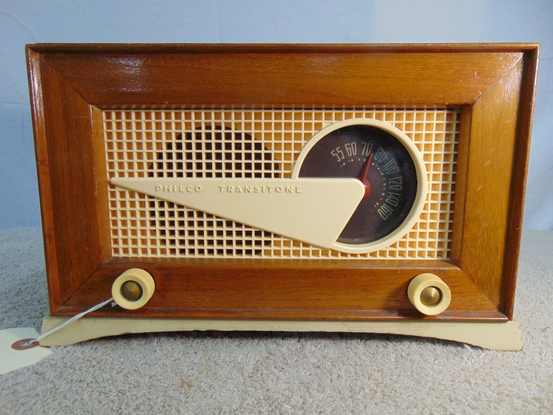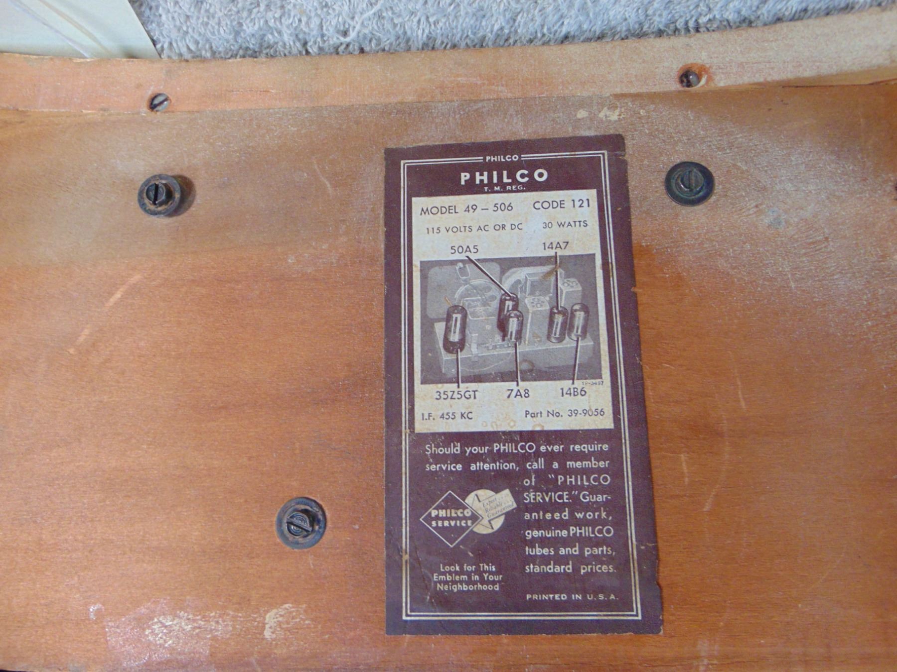 Philco Transitone brown wood table set; model 49-506; original back; works; nice condition