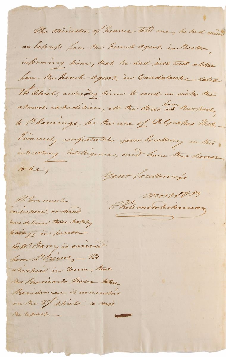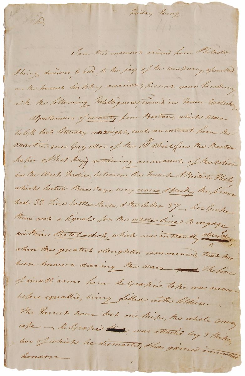 American lawyer and politician from New Jersey (1739–1809) who, as a brigadier general of the New Jersey militia, was one of the most effective militia officers of the American Revolutionary War. He also served as a Continental Congressman from Delaware and a United States Senator from New Jersey. Revolutionary War–era ALS, one page both sides, 8.25 x 13, circa 1782. Lengthy letter to "His Excellency Gov'r Livingston in Trenton," in part: “I am this moment arrived home Philada. I being desirous to hold to the joy of the company assembled on the present happy occasion, present your Excellency with the following Intelligence received in town yesterday. A gentleman of veracity from Boston, which place he left last Saturday night, read an extract from the Martinique Gazette of the 10th April (in the Boston paper of that day) containing an account of the action in the West Indies, between the French & British Fleets, which lasted three days, very…bloody. The former had 33 line battleships & the latter 37. de-Grasse threw out a signal for the whole line to engage within Pistol-shot which was instantly obey'd when the greatest slaughter commenced, that has been known during the wars. The fire of small arms from de Grasse’s tops was never before equaled, being filled with soldiers. The French have lost one ship, the whole convoy safe. De Grasse was attacked by 3 ships, two of which he dismasted, & has gained immediate honor. The Minister of France told me, he had received an express from the French agent in Boston, informing him, that he had just read a letter from the French agent in Guadeloupe dated 24th April, ordering him to send on with the utmost expedition, all the stores from Newport to St. Domingo, for the use of de Grasses fleet. I sincerely congratulate your excellency on this interesting intelligence.” Dickinson adds a brief postscript, “I am much indisposed, as should have delivered some happy tidings in person. Capt. Barry is arrived form St. Orient. Tis whispered in town that the Spaniards have taken Providence—it surrendered on the 27th April, so says the report.” In very good to fine condition, with paper loss along the hinge and integral address leaf. The Battle of Saintes took place from April 9–12, 1782, and, contrary to this report, the British Royal Navy routed the same French fleet that had successfully blockaded the British forces at Yorktown. Led by Admiral Sir George Rodney, the British captured four ships, destroyed one, and captured more than 5,000 troops, including the famed French Admiral Comte de Grasse. The French also suffered 3,000 casualties, and thus the British successfully thwarted a combined French and Spanish attempt to take Jamaica. Pre-certified PSA/DNA.