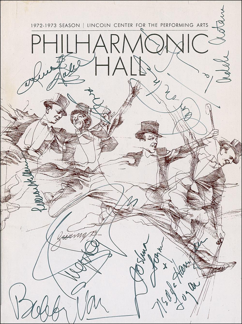 Program from the 1972-1973 season at the Lincoln Center for the Performing Arts Philharmonic Hall, 8.25 x 11, signed in black felt tip on the front cover by Fred Astaire, Ginger Rogers, Lillian Hellman, Joan Fontaine, Arlene Dahl, Bobby Van, Adele Astaire, Tammy Grimes, Joshua Logan, and Nedda Harrigan Logan. In very good condition, with mild creasing and handling wear to the cover, heavier to left side, and Fred Astaire’s signature overlapping Dahl’s name.