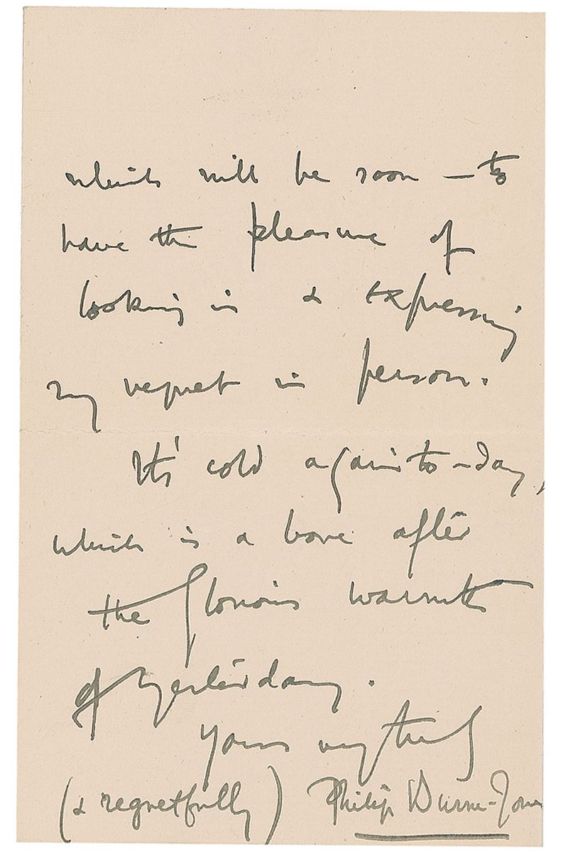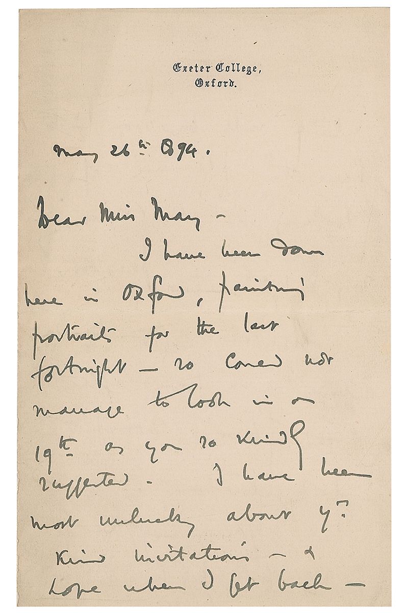 Distinguished painter (1861–1926) who produced over 60 portraits, landscapes, and other images. ALS, one page both sides, 3.75 x 6, Exeter College letterhead, May 26, 1894. Letter to “Miss Mary,” reads, in part: “I have been down here in Oxford, painting portraits for the last fortnight—so could not manage to look in on 19th as you so kindly suggested. I have been most unlucky about you.” In fine condition.