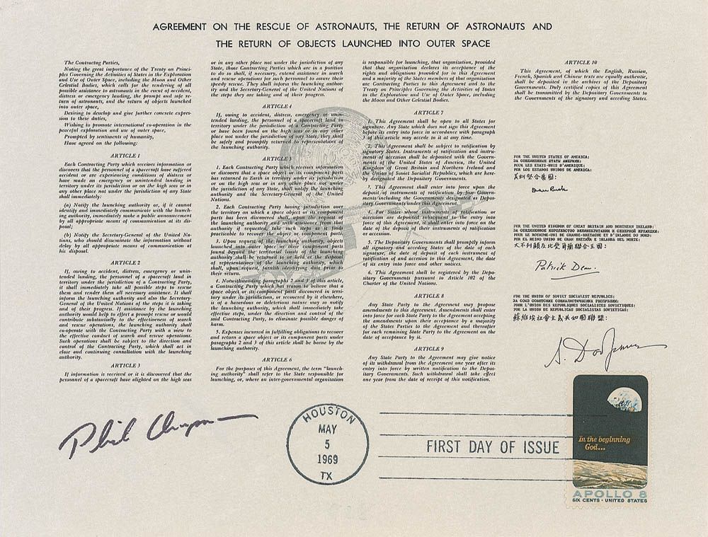 Group Six astronaut and the first Australian-born American astronaut. Souvenir treaty entitled “Agreement on the Rescue of Astronauts, the Return of Astronauts and the Return of Objects Launched into Outer Space,” on an 8 x 6 sheet of parchment-type paper, signed in black felt tip in the lower left. Treaty also bears a postal cancellation, a First Day of Issue stamp, and an eight-cent Apollo 8 postage stamp. In fine condition. Chapman is one of the toughest astronaut signatures to acquire.