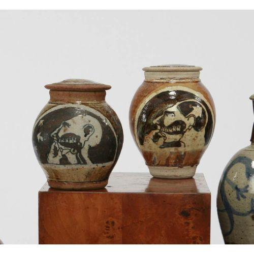 Artist Name: Philip Cornelius<BR>Manufacturer: <BR>Description: Pair of stoneware lidded jars<BR>Circa: circa 1970<BR>Medium: <BR>Signature: <BR>Measurements: Larger jar 10"h<BR>Edition: <BR>Notes: Decorated with Funk skul design<BR>Literature / Provenanc