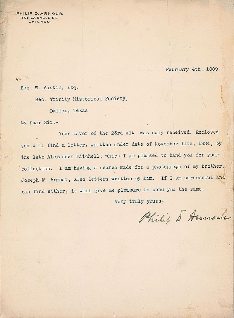 Industrialist (1832–1901) whose pork packing plant, Armour and Co., introduced refrigeration and revolutionized methods of canning. TLS, one page, 8 x 11, personal letterhead, February 4, 1889. Letter to the secretary of the Trinity Historical Society. In part: “Enclosed you will find a letter…by the late Alexander Mitchell, which I am pleased to hand you for your collection. I am having a search made for a photograph of my brother, Joseph F. Armour, also letters written by him.” In very good condition, with intersecting folds, toning and soiling to edges, as well as some dampstaining along right edge.
