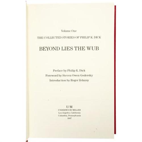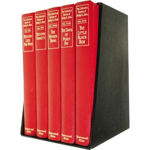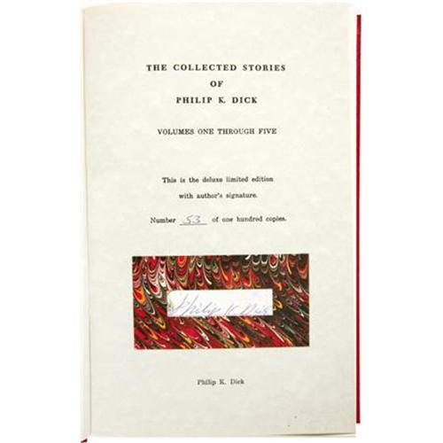 <B>Philip K. Dick: Signed Deluxe Limited Edition of <I>The Collected Stories of Philip K. Dick</B></I></B></I> (Los Angeles: Underwood Miller, 1987), first edition offered in the limited deluxe edition, numbered 53 of 100 copies and signed "<I>Philip K. Dick</B></I>" on a special limitation page bound in Volume I. All volumes are bound in red cloth with gilt spine titles and black cover titles, 8vo (6.5" x 9.5") and are in as new condition. The five volume set includes: <B><I>Beyond Lies the Wub</B></I></B></I>: 404 pages, <B><I>Second Variety</B></I></B></I>: 395 pages, <B><I>The Father-Thing</B></I></B></I>: 376 pages, <B><I>The Days of Perky Pat</B></I></B></I>: 380 pages, and <B><I>The Little Black Box</B></I></B></I>: 395 pages.<BR><BR><b>Shipping:</b> Books & Catalogs (<a target="_blank" href="http://www.heritageauctions.com/common/shipping.php">view shipping information</a>)