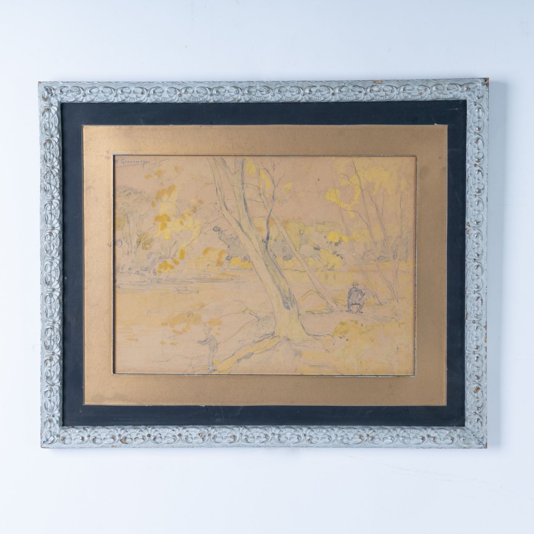 A beautiful watercolor on brown paper, capturing a serene lakeside scene with fishermen at work. On reverse: property of Steven Schultz. Housed on a wooden coated frame. Sight size: 14.25''L x 1.5''H. Frame size: 21.5''L x 1''Wx 17.5''H. Signed on upper left side, Ph. Gronemeyer.