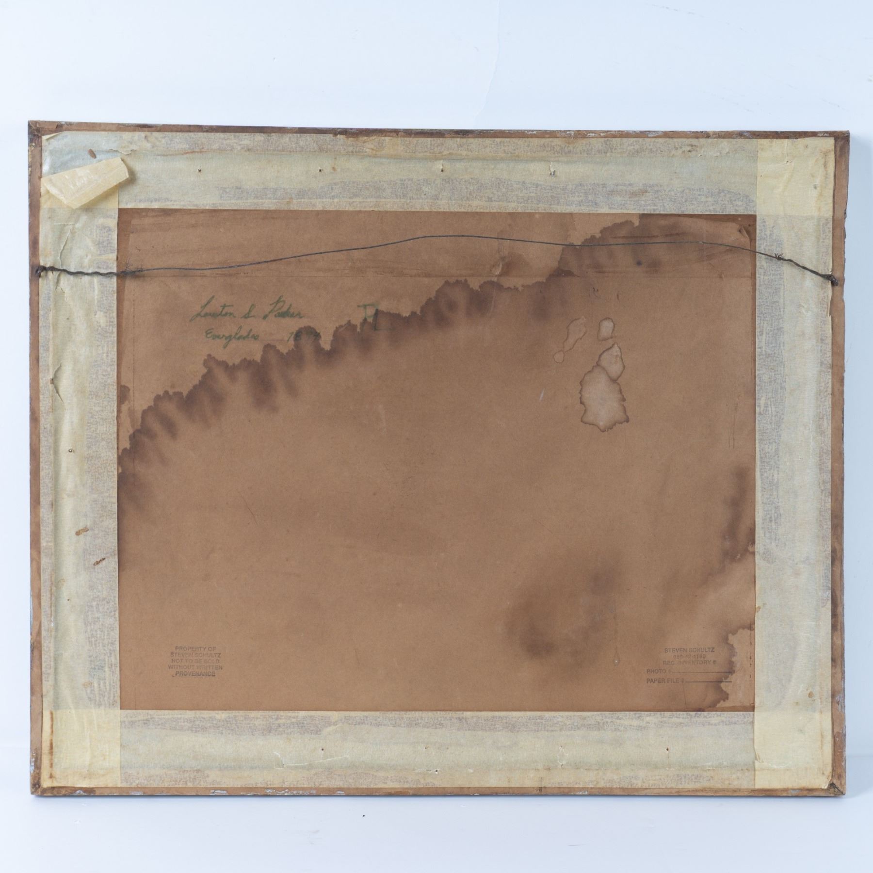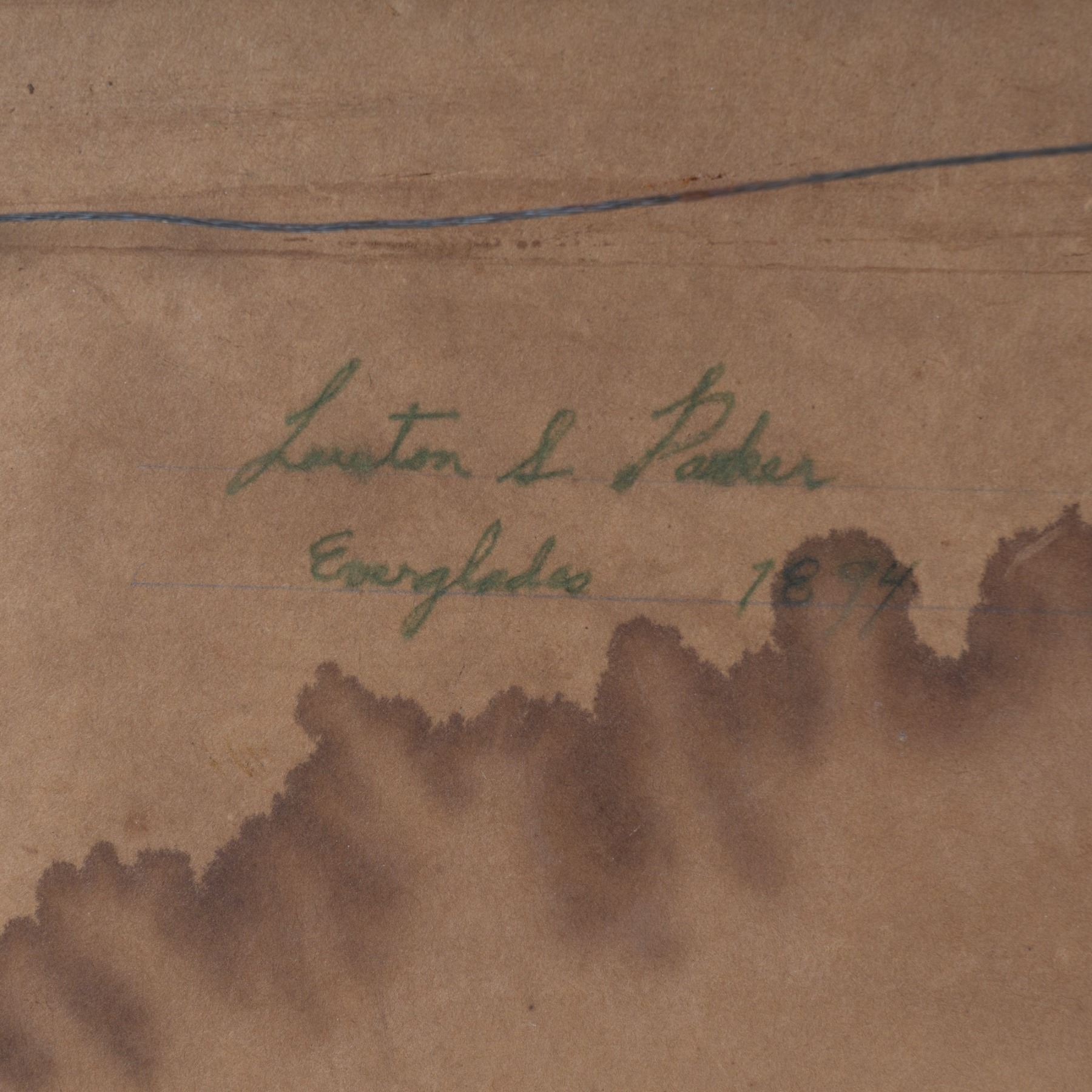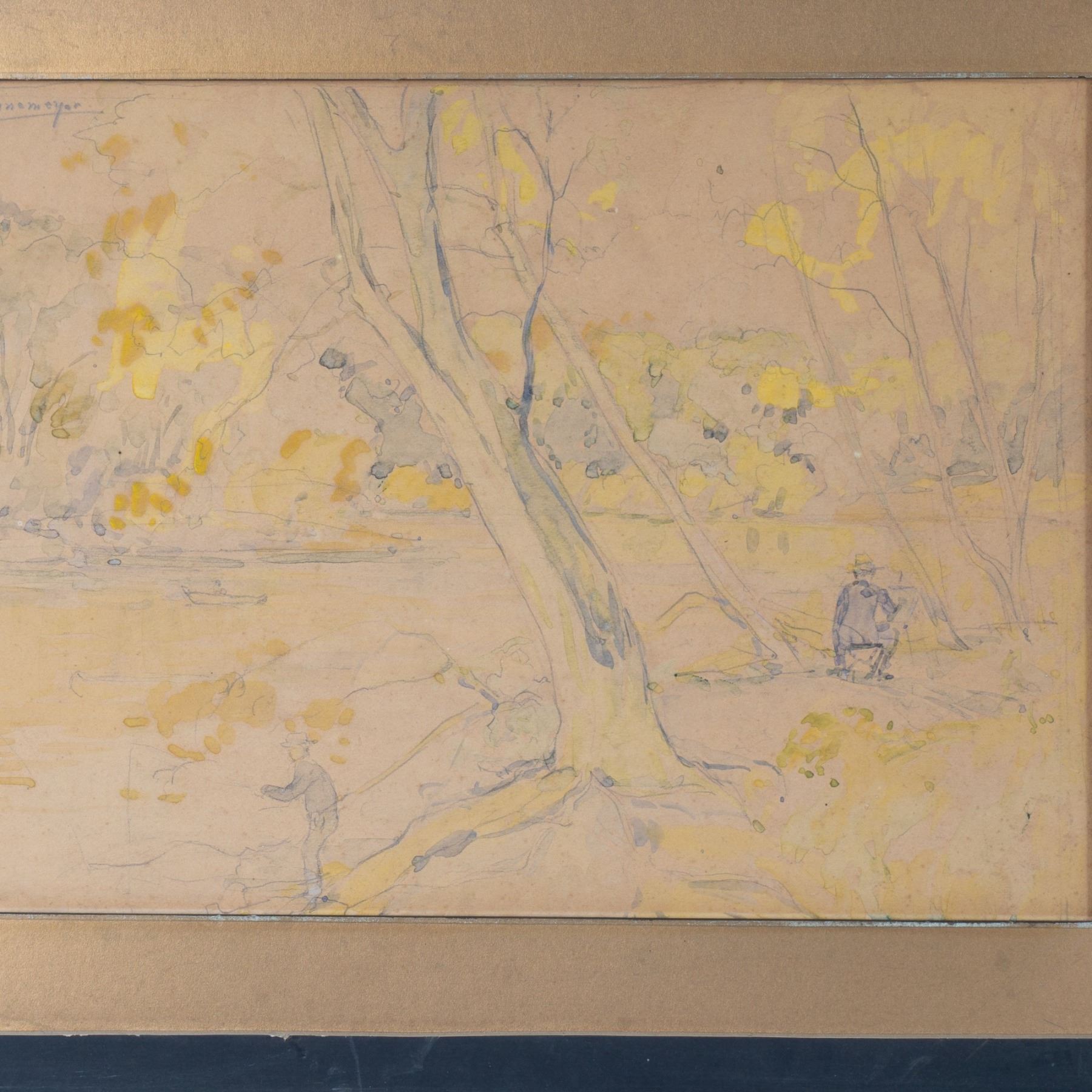 A beautiful watercolor on brown paper, capturing a serene lakeside scene with fishermen at work. On reverse: property of Steven Schultz. Housed on a wooden coated frame. Sight size: 14.25''L x 1.5''H. Frame size: 21.5''L x 1''Wx 17.5''H. Signed on upper left side, Ph. Gronemeyer.