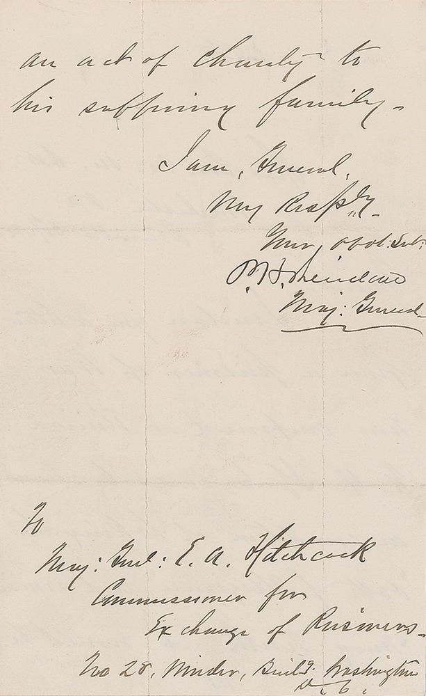 Civil War-dated LS signed "P. H. Sheridan," one page both sides, 5 x 8, December 30, 1864. Letter to "Maj. Genl. E. A. Hitchcock, Commissioner for Exchange of Prisoners," in part: "I enclose you a letter from a 'prisoner of war,' now confined at Elmira N.Y. If he could be released on condition of taking the 'oath of allegiance'…it would be an act of charity to his suffering family." In fine condition, with intersecting folds.