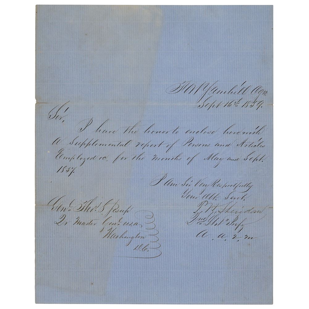 LS signed “P. H. Sheridan,†one page, 7.75 x 10, September 16, 1859. Brief letter to General Thomas Jesup, in full: "I have the honor to enclose herewith a supplemental report of Persons and Articles Employed etc. for the months of May and Sept. 1857." In very good to fine condition, with faint staining to the left side. A desirable association piece connecting two notable Union Army officers.