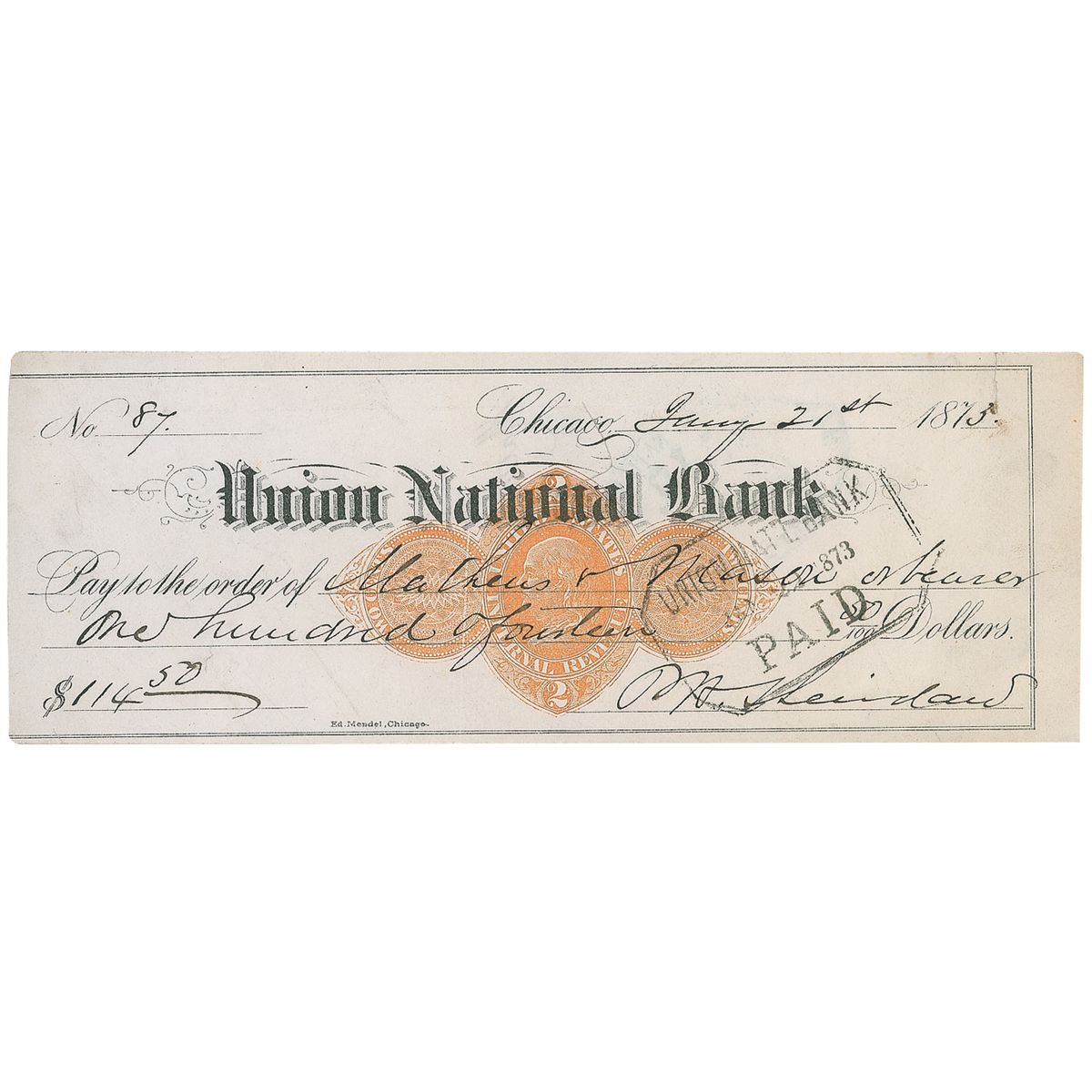 Bank check, 7.25 x 2.5, filled out in another hand and signed by Sheridan, “P. H. Sheridan,” payable to Mathews & Mason or bearer for $114.50, January 21, 1875. In very good condition, with two vertical folds, cancellation cut to upper portion, trimmed left edge, and bank stamps lightly affecting portions of signature.