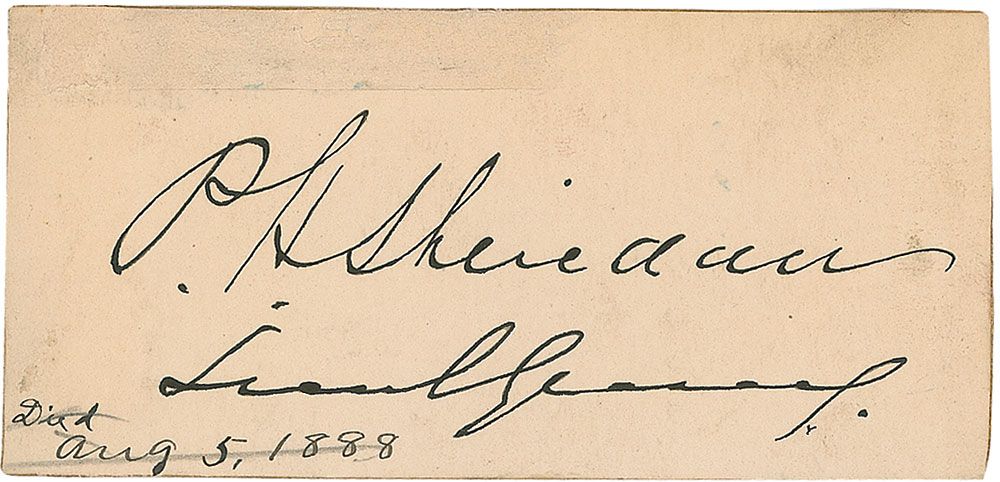 Ink signature, “P. H. Sheridan, Lieut General,” on an off-white 4 x 2 card, with a collector’s notation of “Died Aug 5, 1888,” in the lower left corner. Some scattered light soiling, light surface loss along top edge, mounting remnants to reverse, and a trimmed right edge, otherwise fine condition. Accompanied by an unsigned 5 x 7 glossy portrait.