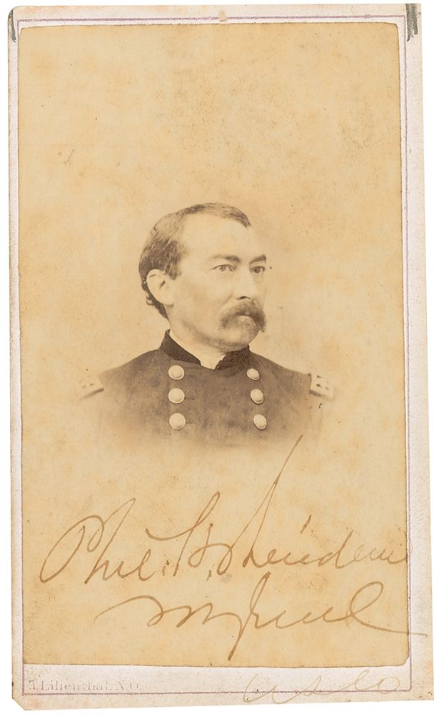 Union general (1831–1888) whose cavalry command blocked Lee’s escape at Appomattox. Original 2.25 x 4 carte-de-visite bust portrait of Sheridan, by T. Lilienthal of New Orleans, signed at the bottom of the image in black ink, “Phil. H. Sheridan, Mj. Genl, U.S.A.” Moderate scattered foxing and soiling, and small pencil notations to the upper corners, otherwise fine condition.