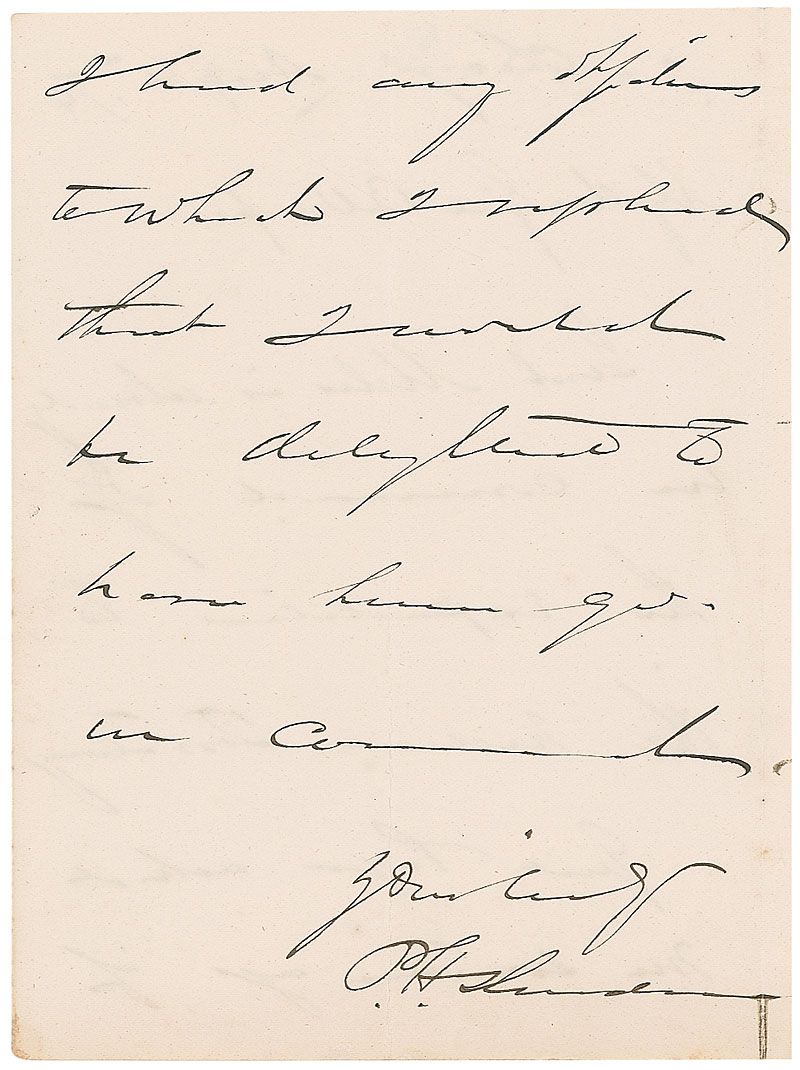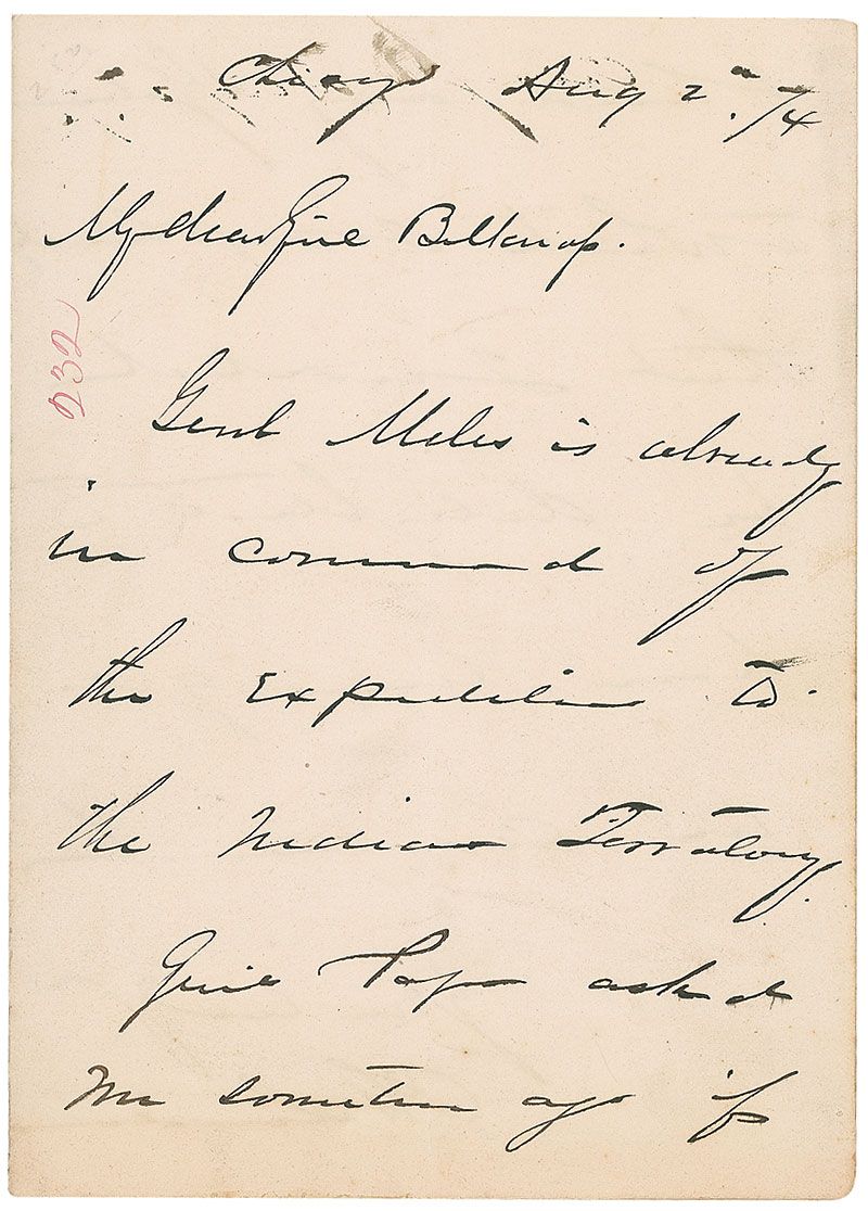 Union general (1831–1888) whose cavalry command blocked Lee’s escape at Appomattox. ALS signed “P. H. Sheridan,” one page both sides, 5 x 7, August 2, 1874. Letter to Secretary of War William Belknap. In full: “Genl Miles is already in command of the expedition to the Indian Territory. Genl Pope asked me some time ago if I had any officers to which I explained that I would be delighted to have him go in command.” A central vertical fold, through a single letter of signature, a few light creases, an ink notation and moisture spot to first page, and mounting remnants to reverse of second integral page, otherwise fine condition. Miles would lead many campaigns against the American Indian tribes in the Great Plains, including a defeat of the Comanche. An interesting letter with great association between four esteemed Union commanders.